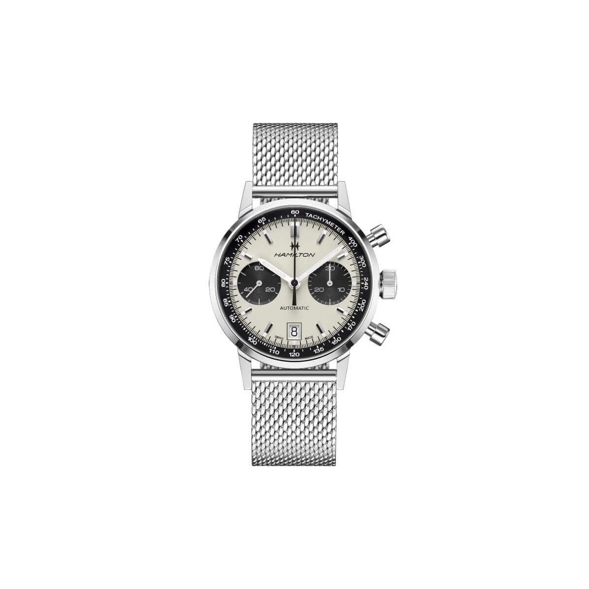 Hamilton Intra-Matic Chrono Automatic watch, from the American Classic collection, with time only function and self-winding chronograph movement. The watch is made with a Milanese mesh bracelet in steel and a 40 mm steel case with a white dial with black chronograph balls, hence the definition Panda, hands with LumiBrite, baton indexes and blue bezel. Deployant clasp.