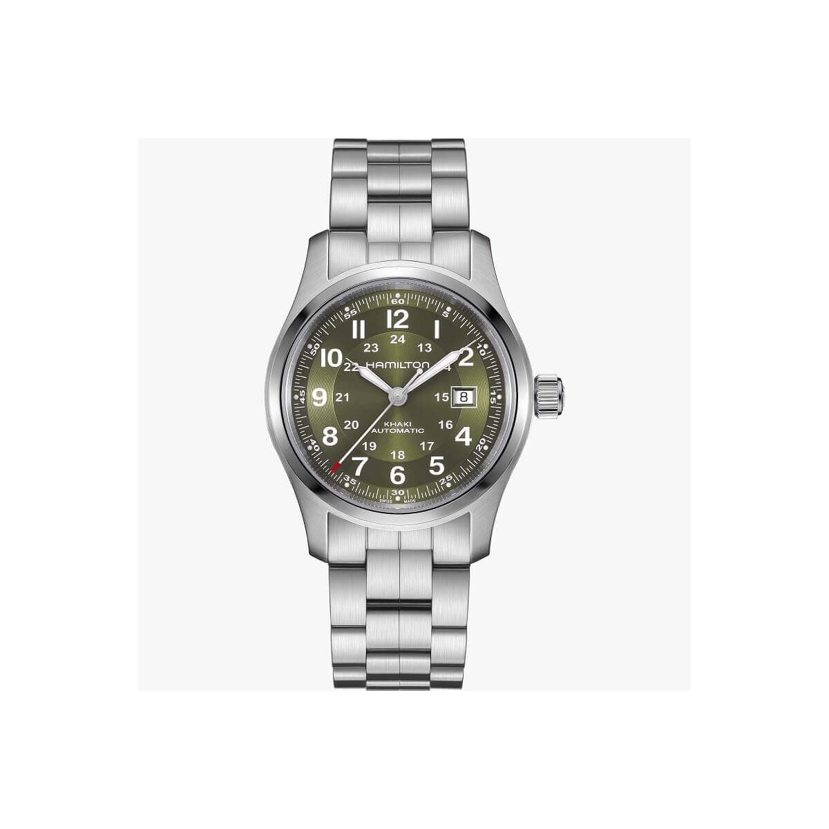 Khaki Field Automatic 42mm watch with H-10 automatic movement with 80 hours of power reserve, steel case and bracelet and green dial with Arabic numerals.