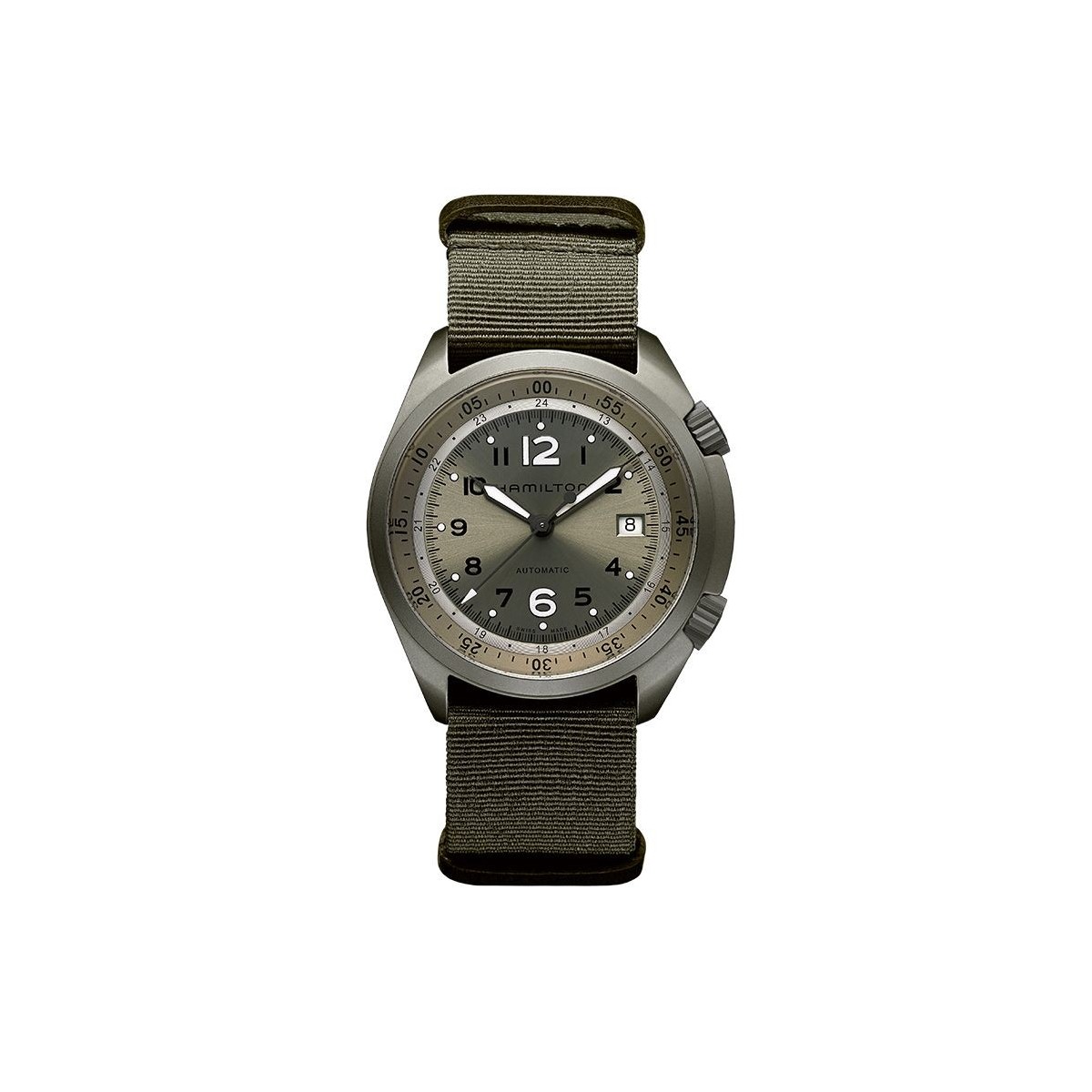 Hamilton Pilot Pioneer Aluminium Automatic with aluminum case and fabric khaki green bracelet with brown leather straps - cod:H80405865