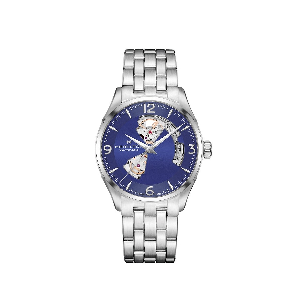 Watch with automatic movement Jazzmaster Viewmatic Open Heart line, blue dial with visual movement and indexes and numbers applied, steel case and bracelet and open back.-