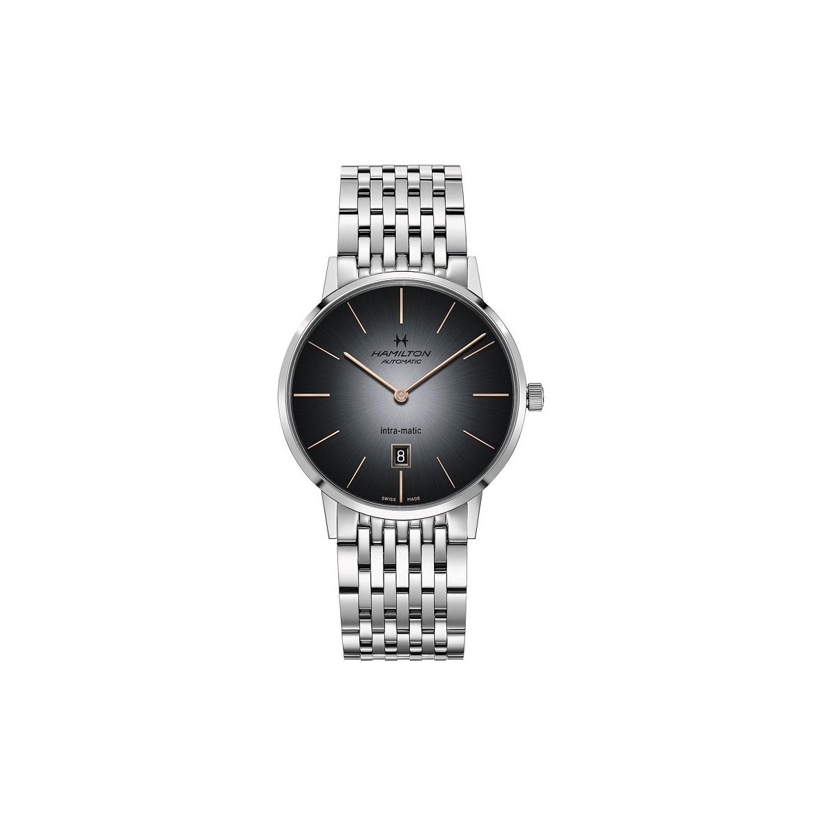 Gray dial with rosé indexes and date window at six o'clock for this Hamilton Intra-Matic mechanical self-winding 38 mm case.