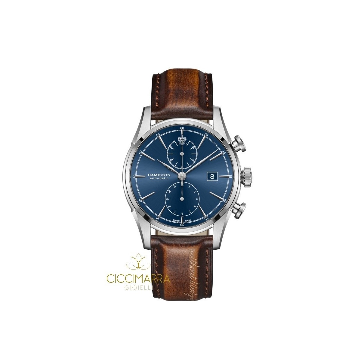 Inspired by Andrew Hamilton, owner of the first Hamilton watch manufacturer in Pennsylvania, these watches are a contact between past and future. Leather straps carry the inscription "Without liberty, life is a misery", a reference to the rich Hamilton tradition. This watch mounts the H-21 which is a powerful automatic chronograph movement with an enhanced 60-hour power reserve. Case material: Steel; Glass: Sapphire; Movement: Automatic winding; Case size: 42mm; Waterproofing: Water resistance 5 bar; Color: Brown; Lug width: 22mm loop width; Folding buckle; Strap type: Calfskin; Collection: American Classic;
