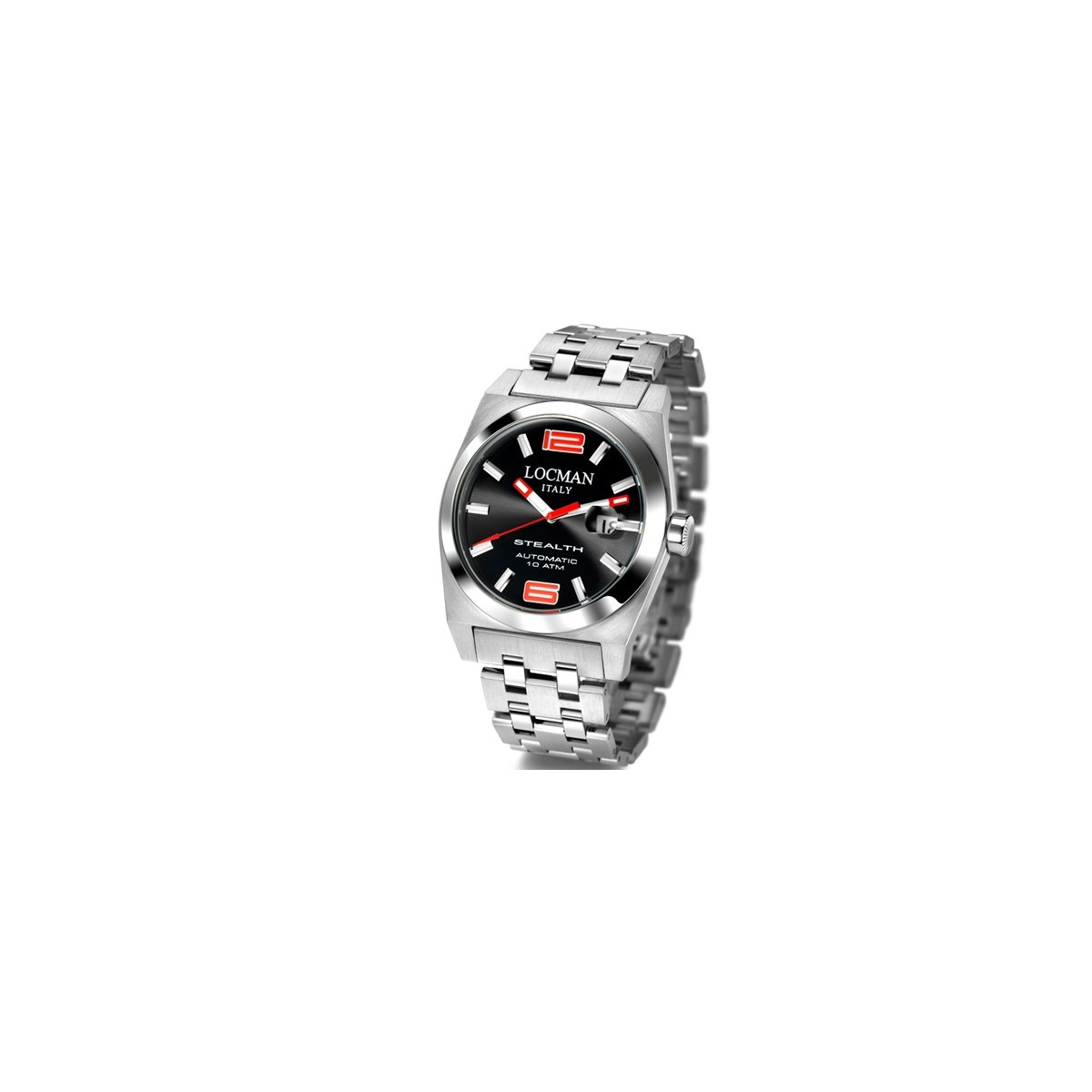 Men's watch with polished and brushed stainless steel case and bracelet, automatic movement, numbers and hands with red details, titanium back tightened with screws, Sapphire Crystal lens dial.