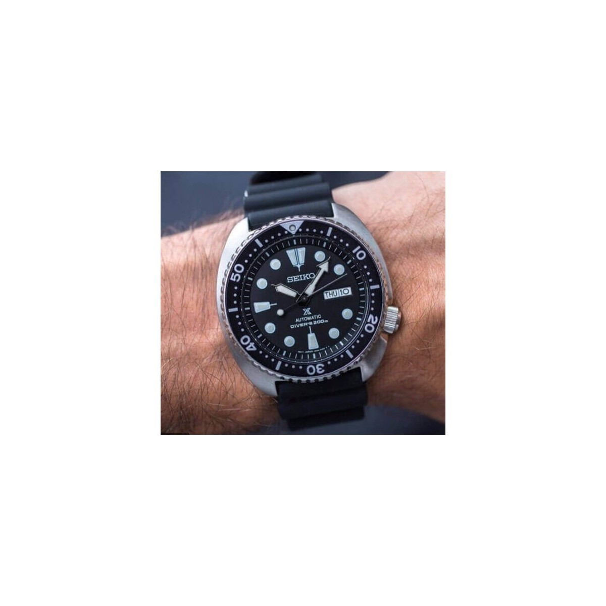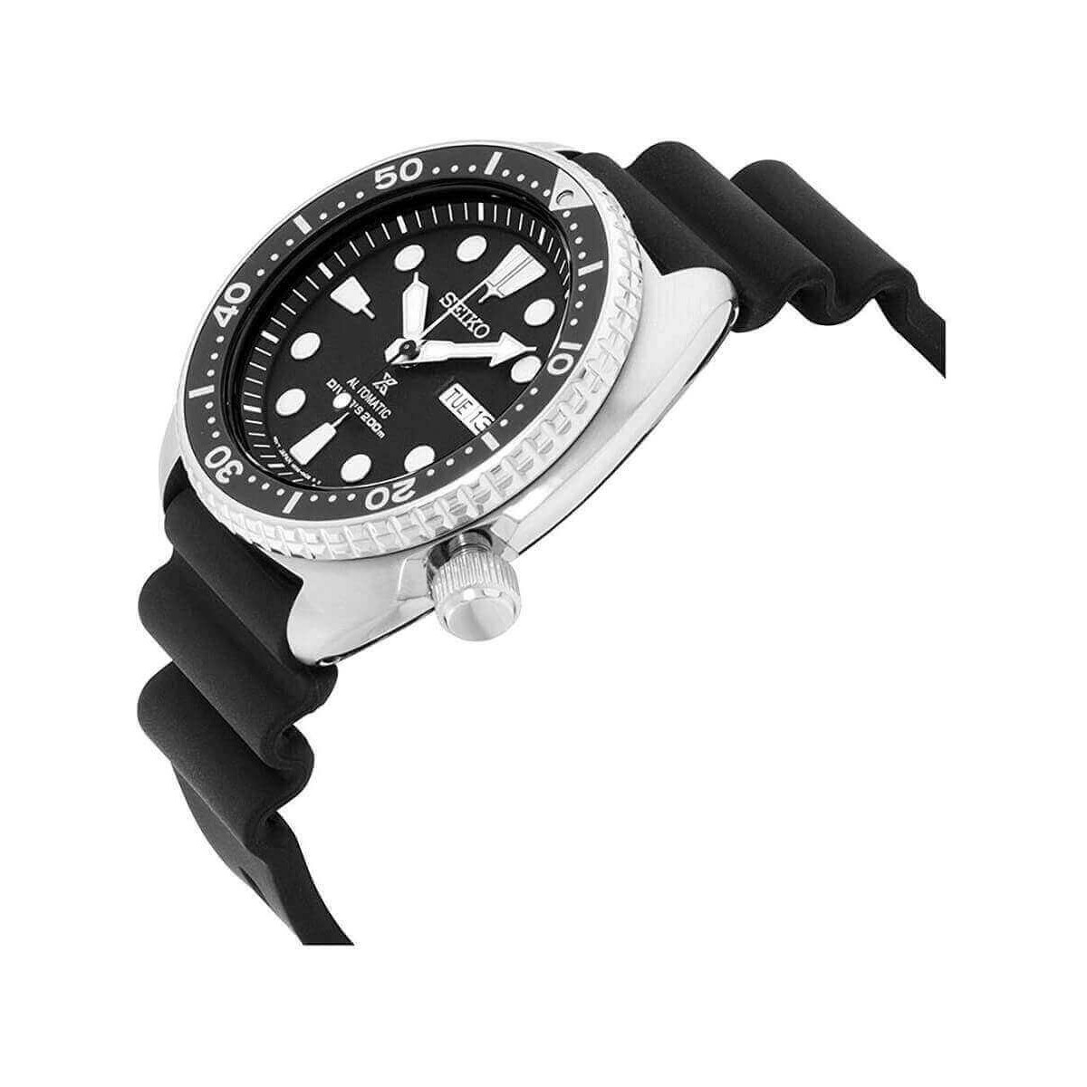 Men's watch with stainless steel case, black silicone strap, black dial and rotating bezel, white indexes and hands, date display. The characteristic and historic tortoise shell of Seiko makes this collection immediately recognizable and unique.