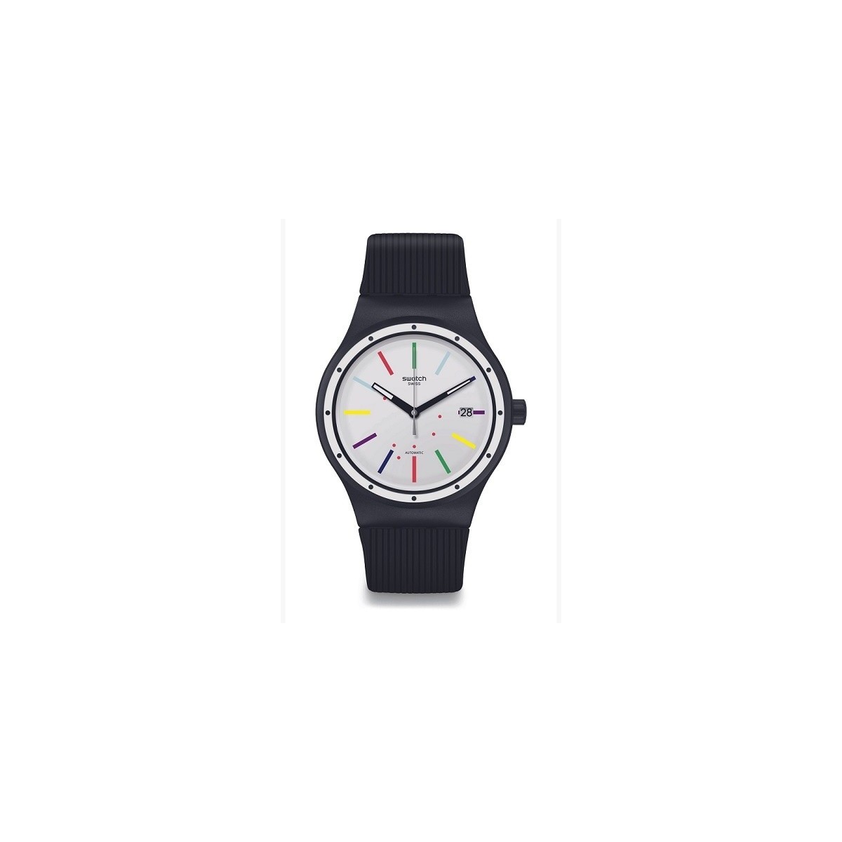 Swatch watch, from the Sistem Col-Ora collection, with time only function and self-winding mechanical movement. The watch has a nice and youthful black silicone strap, with plastic buckle closure and large black case, white dial and multicolor hands.