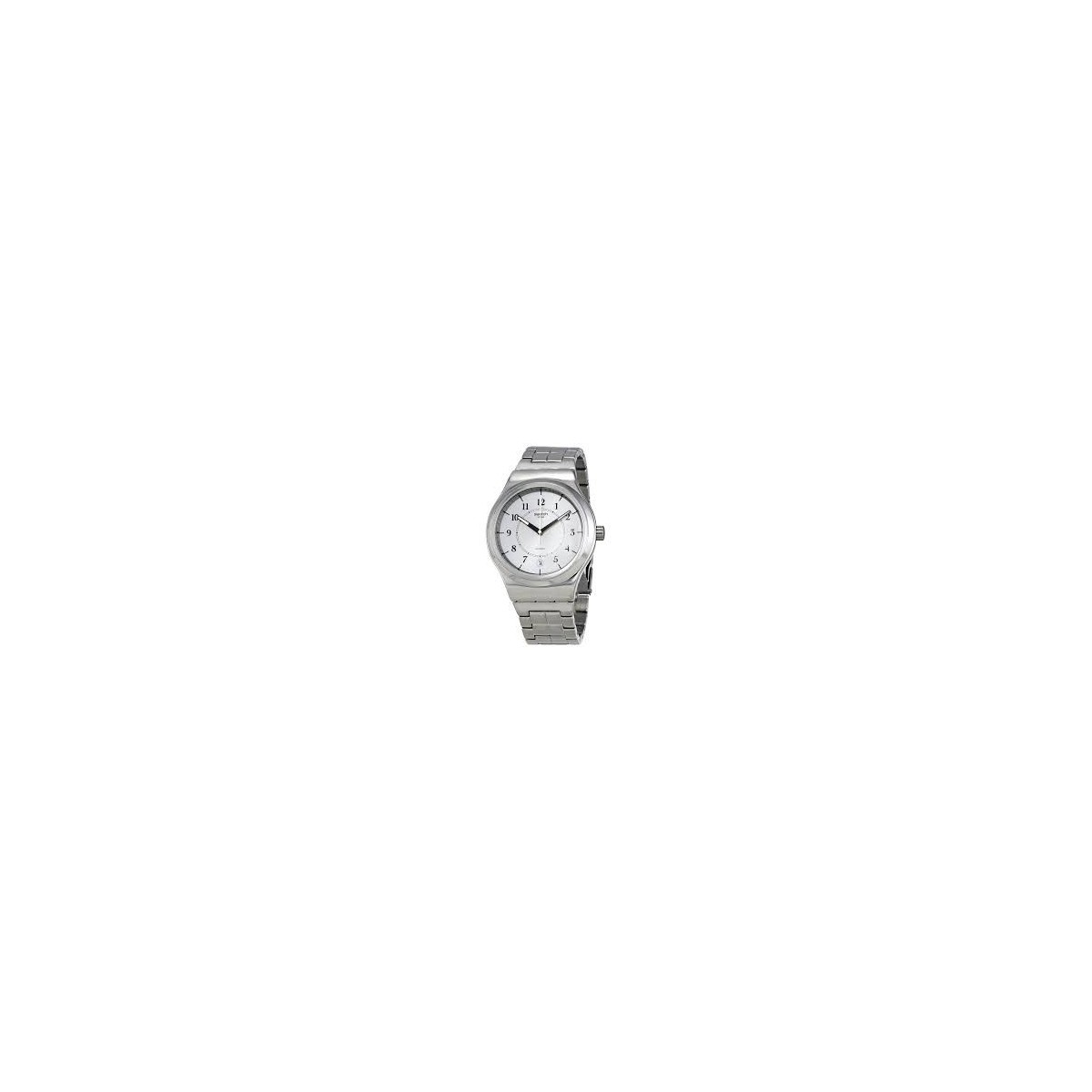 Silver brushed dial with black and date indexes at 6 o'clock. The polished stainless steel bezel features notches that mark the hours, and overlaps a shiny stainless steel case that hosts the automatic movement of SISTEM 51, visible through the open back that Reveals the components with chess printing; Silver polished stainless steel strap with engraved central mesh.
