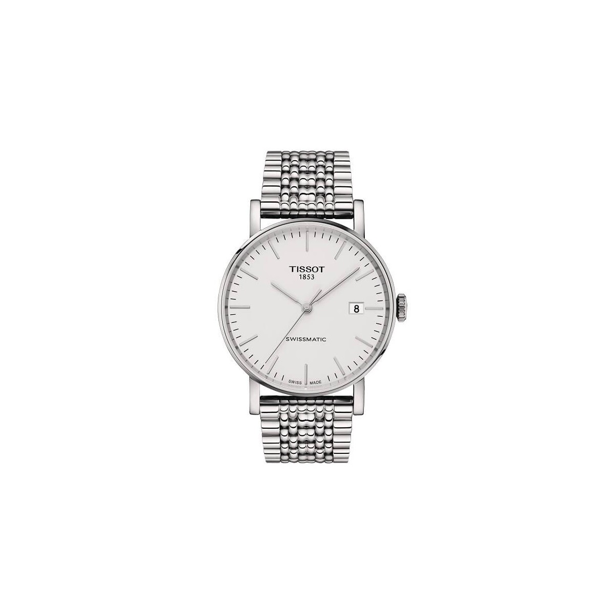 Everytime Swissmatic Tissot men's watch, from the T-Classic collection, large, with Swiss automatic movement made of 316L stainless steel, with round case with a diameter of 40mm, visible caseback and domed and scratch-resistant sapphire crystal that protects the white dial with indexes and silver hands and date window at three o'clock.