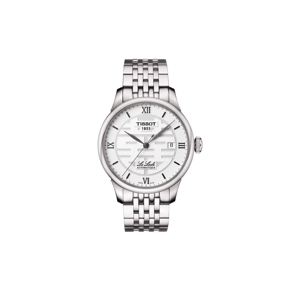 - Stainless steel case with a stainless steel bracelet. Fixed stainless steel bezel. Silver dial with grey hands and index hour markers. Roman numerals mark the 3, 6, 9 and 12 o'clock positions. Minute markers around the outer rim. Dial Type: Analog. Date display at the 3 o'clock position. Automatic movement. Scratch resistant sapphire crystal. Screw down crown. Case diameter: 39.3 mm. Round case shape. Band width: 19 mm. Band length: 8.5 inches. Push button hidden clasp. Water resistant at 30 meters / 100 feet. Functions: date, hour, minute, second. Casual watch style. Tissot T-Classic Le Locle Silver Dial Stainless Steel Mens Watch
