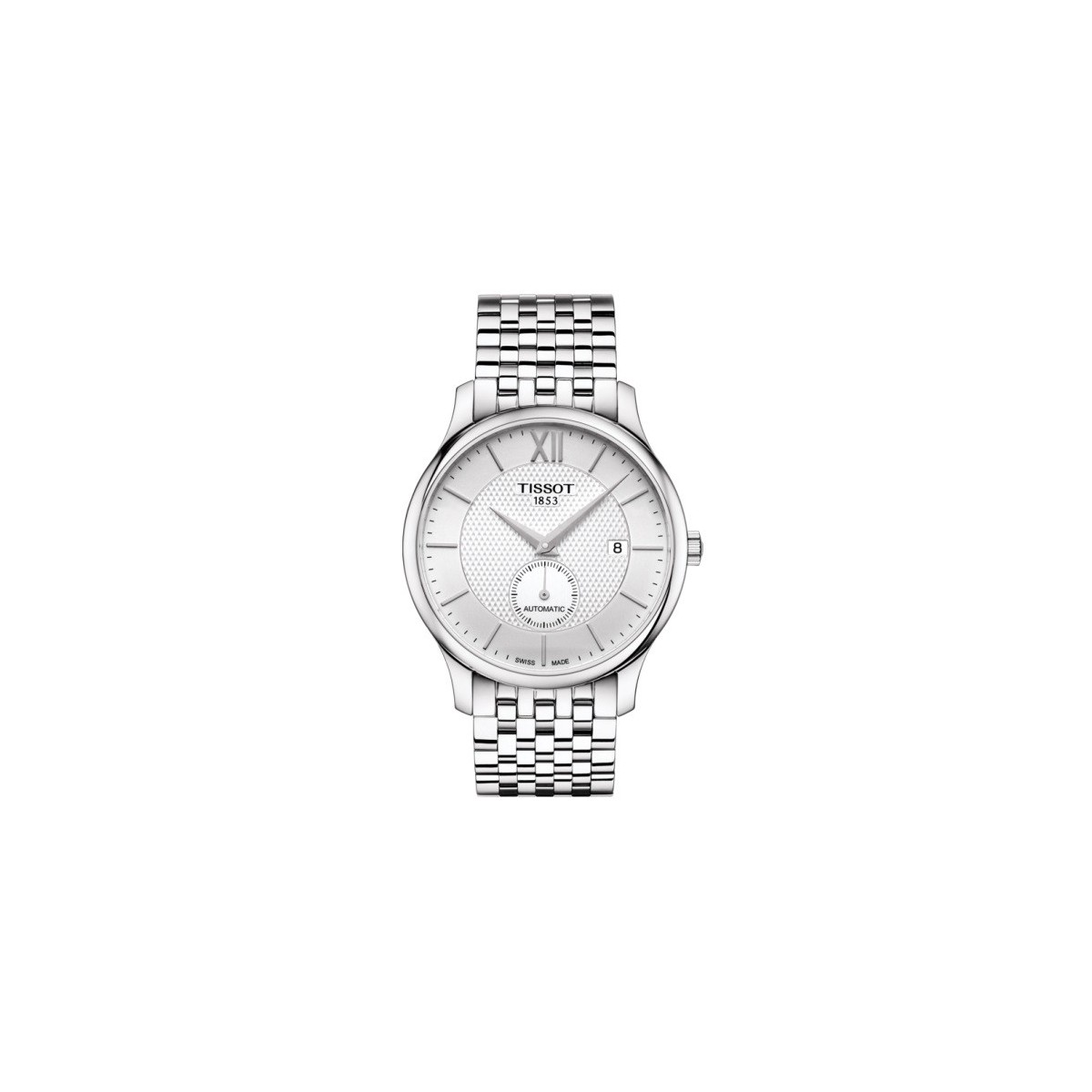 TISSOT TRADITION AUTOMATIC SMALL SECOND-reference: T0634283603800-Swiss made-warranty: 2 Years of Warranty-collection: T-Classic-Case shape: round-water resistance: resistant to 3 bar (30 m/100 ft)-body material: stainless steel case 316 L PVD Rosé-Size case: 40 mm-lug distance: 20-case height: 11.16-case Options case back-weight (g): 70.0000-Crystal: scratch-resistant Sapphire Crystal-dial color : Silver-indices: indices and Romani-movement: Swiss automatic ETA Caliber, Model 2825-2-1/2-11 ''-diameter (mm): 25.6-jewelry: reserve: 25-38 hours power reserve-band Reference T600037906-buckle: Butterfly clasp