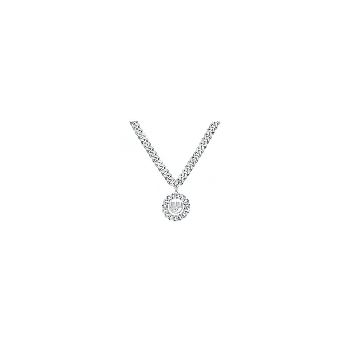 Necklace with pendant signed by the well-known influencer Chiara Ferragni belonging to the Bossy Chain collection. Made of rhodium-plated steel with a pendant depicting the iconic Blinking Eye.