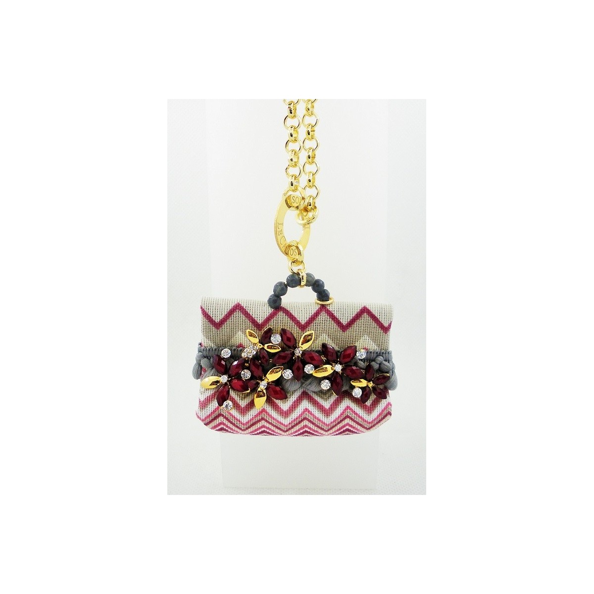 Long necklace with handbag pendant, floral inserts and Swarovski crystals, red, pink and gray; chain metal gold plated