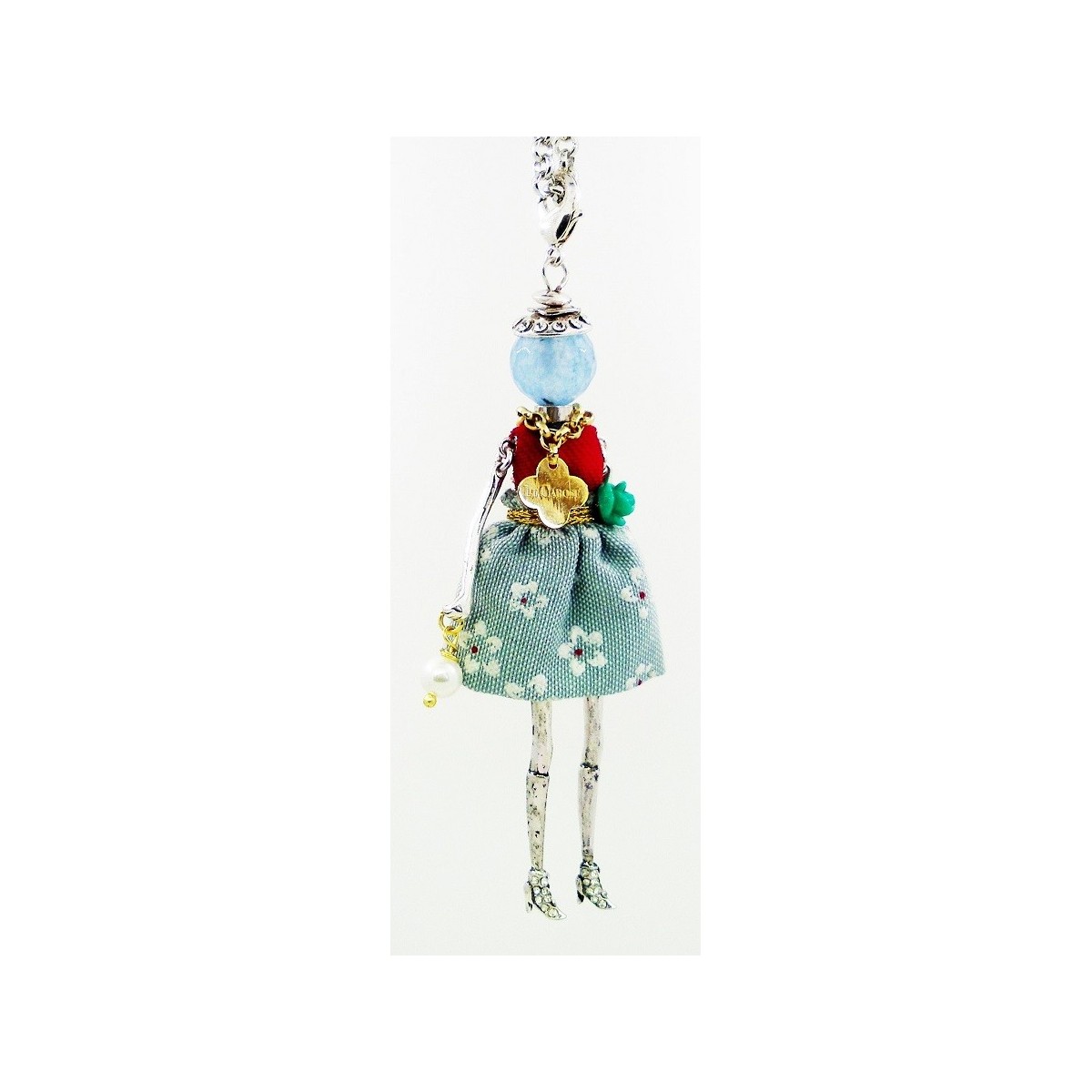 The Carose By Todo chanel long necklace with pendant Of Encanto doll; spring dress with Swarovski Pearl light blue synthetic head details