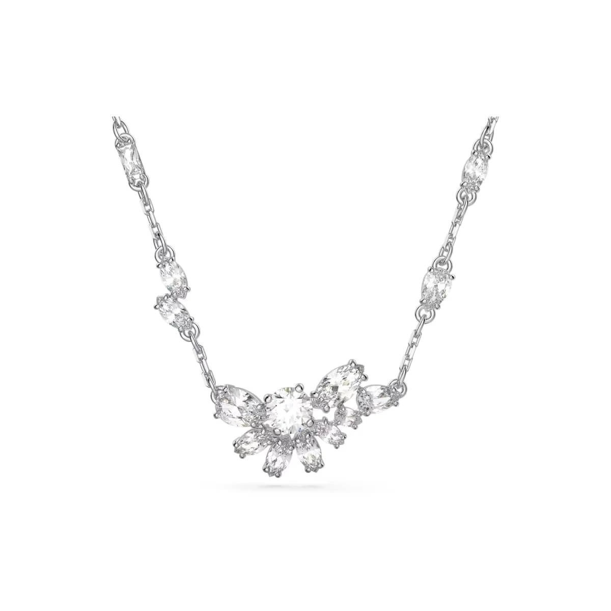 Swarovsky feminine girogola necklace, from the Gema collection, made of rhodium-plated metal and composed of a series of white crystals with different geometric shapes that are composed in an asymmetrical floral central motif. Adjustable lobster clasp closure.