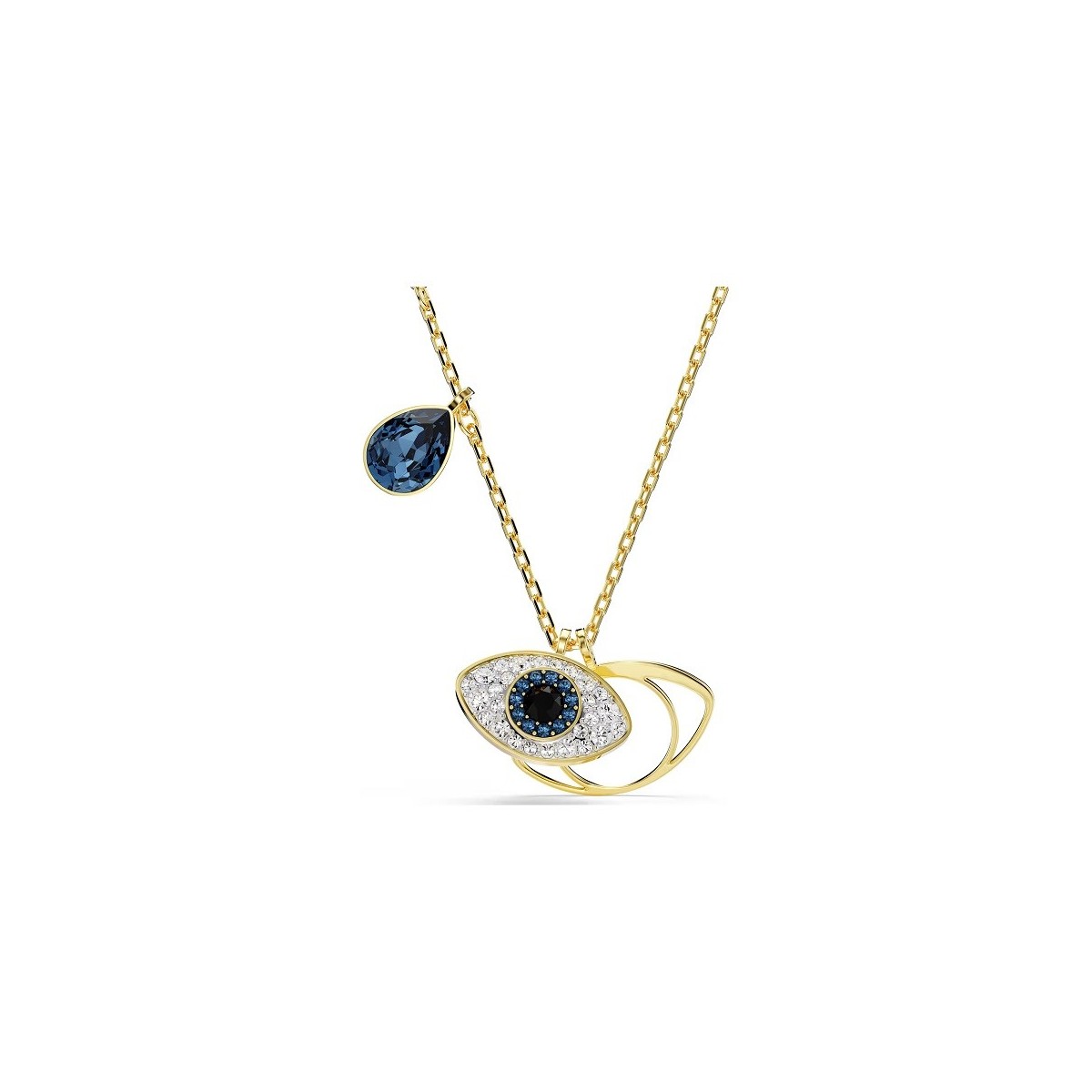 Pendant necklace, from the Symbolica collection, for women Swarovski, enhance the interaction between geometry and light. The necklace is made with gold-colored plating, the pendant features a motif with the eye of Allah domed with blue, black and Cry crystal pavé and another with gold-colored plating.