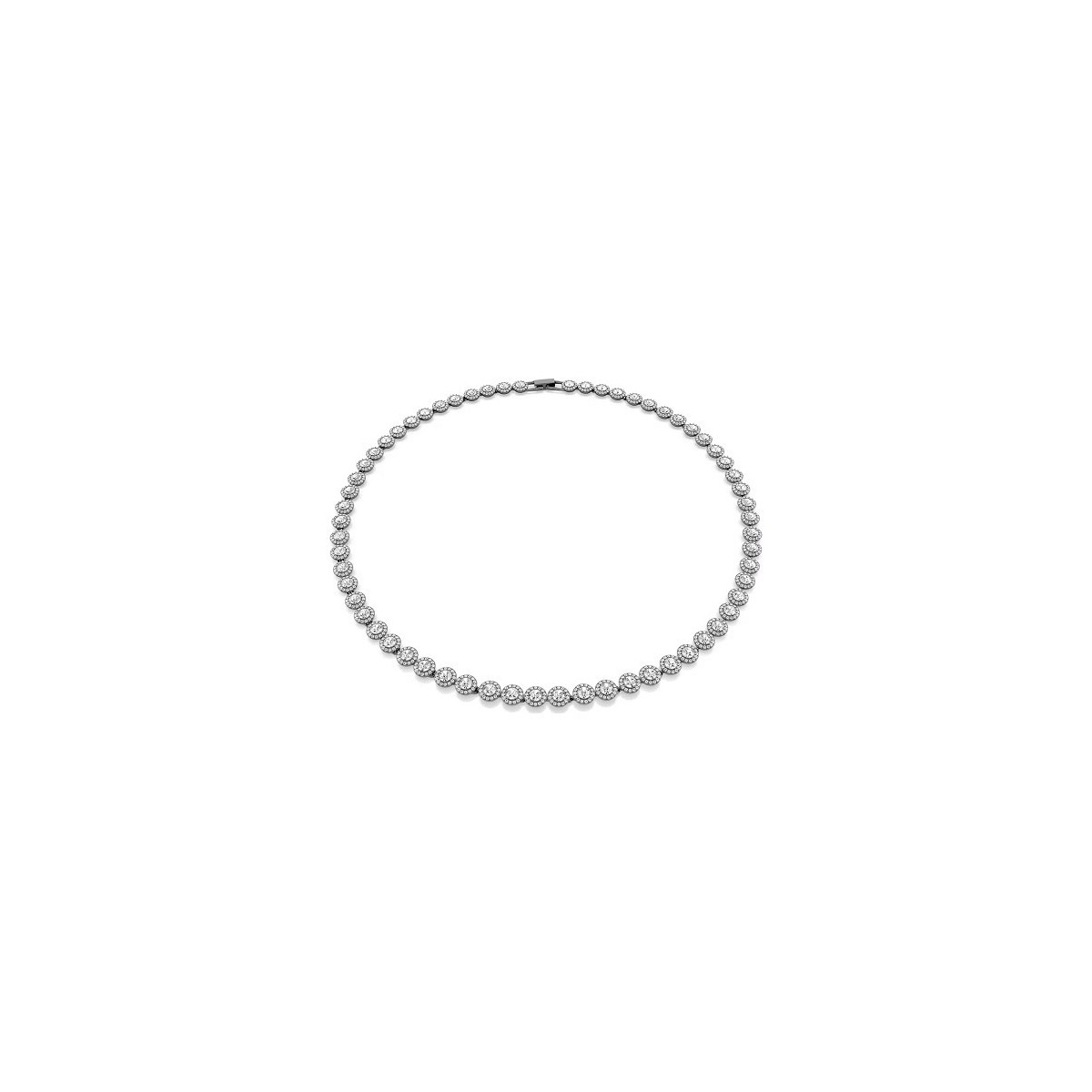 Tennis necklace, from the Una Angelic collection, for women Swarovski, enhances the interaction between geometry and light. The necklace is made with ruthenium plating and features individual links in the center of each of which is set a brilliant crystal framed by a halo of smaller round-cut crystals.