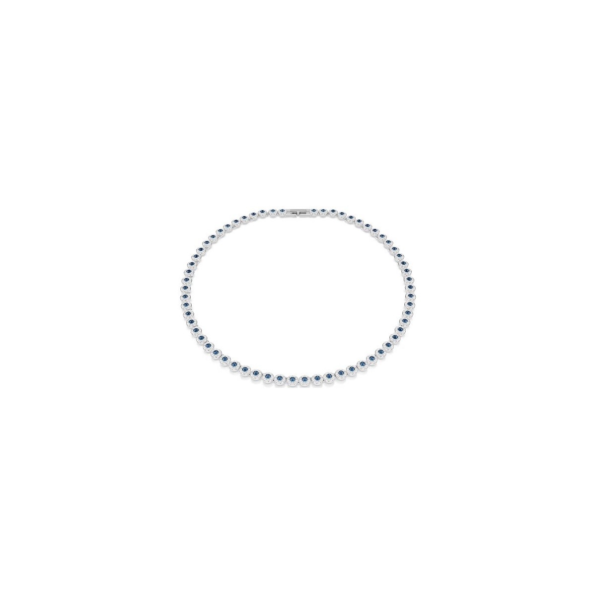 This tennis necklace from the Una Angelic collection for women by Swarovski showcases the interplay of geometry and light. The rhodium-plated necklace features blue crystals and pavé. The clasp closure folds over.