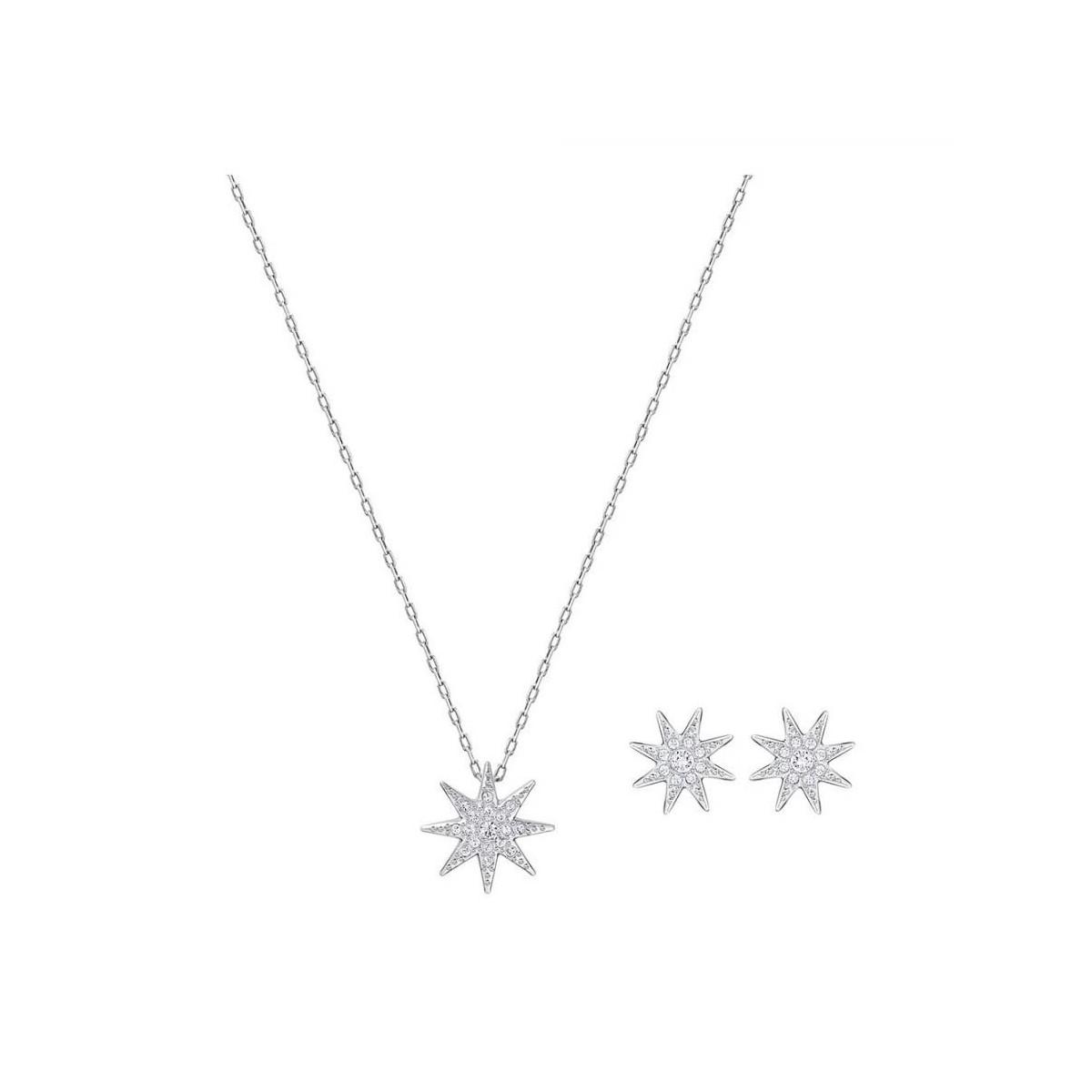 Rhodium-plated necklace set with star-shaped pendant with pave white Swarovski crystals and studs in the shape of a star
