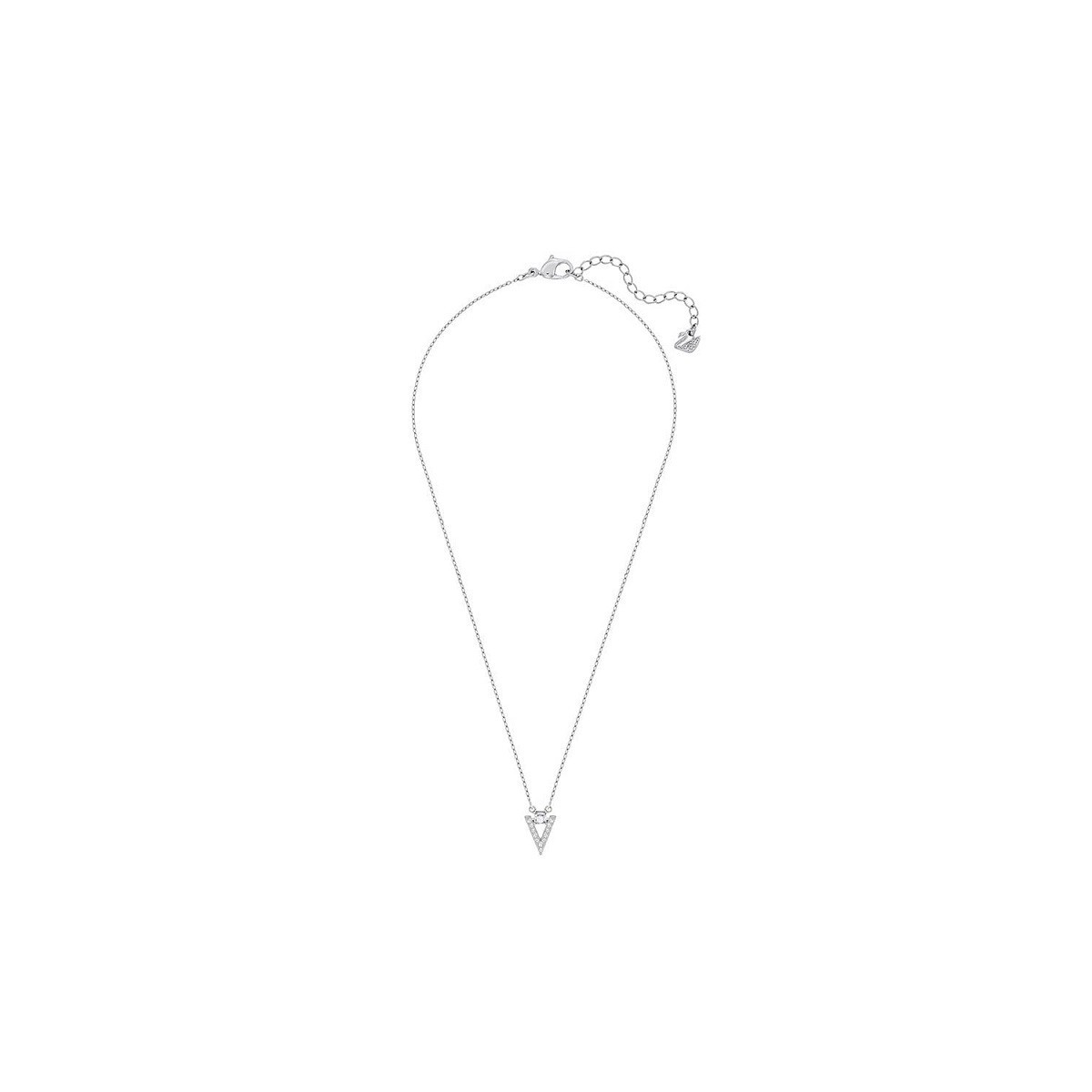 Rhodium-plated crew-neck necklace with white crystal triangular shaped pendant mounted in grif and snap hook with swan logo