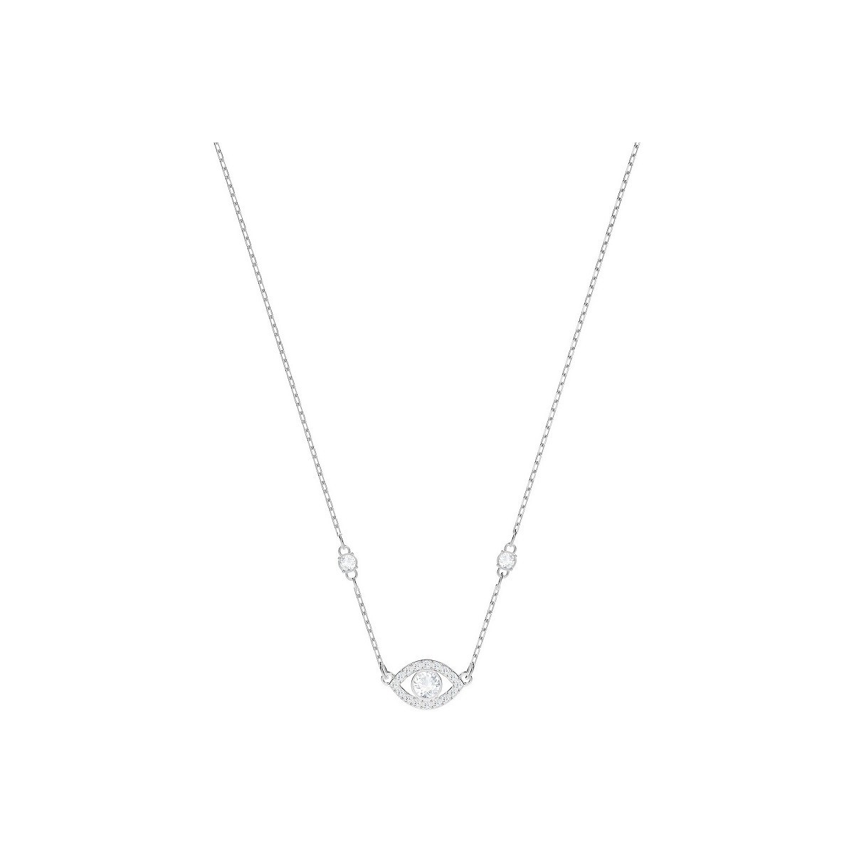 Women's necklace, round throat, with eye-shaped pendant and white crystals mounted on a thin-chain rhodium base; adjustable length with carabiner closure