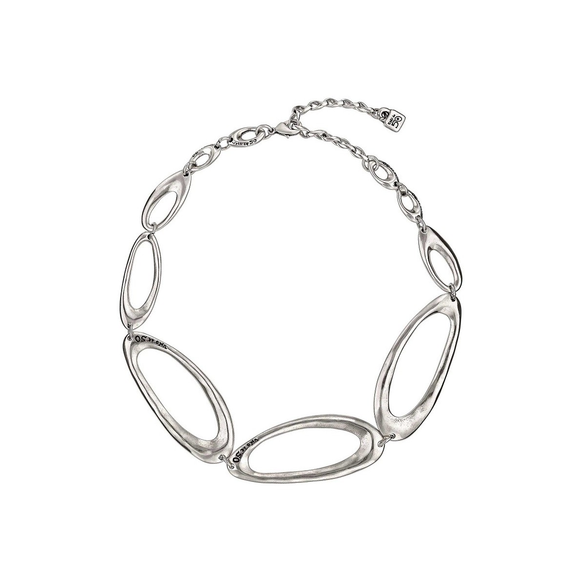 Woman necklace in metal silver plated irregular oval motif and carabiner closure, handmade made in Spain