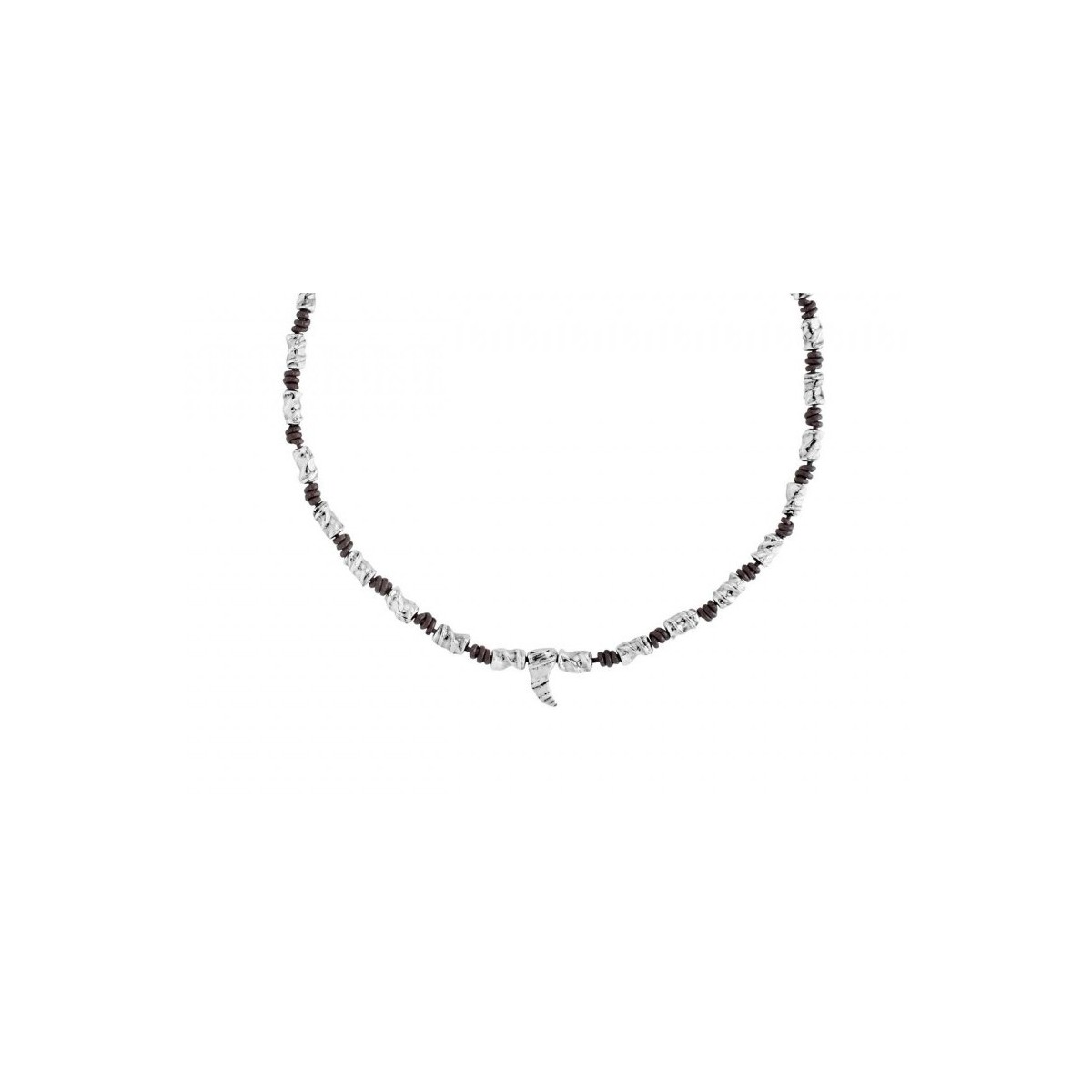 Dark brown leather man long necklace with nuggets and Horn-shaped pendant in silver plated metal