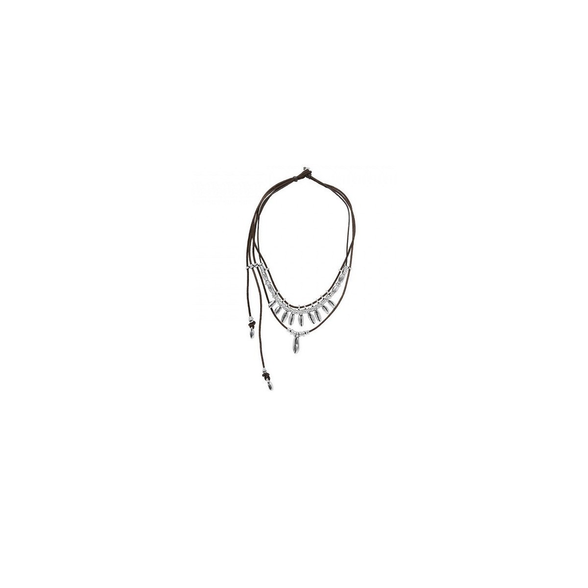 Short necklace with different dark brown leather laces and silver beads. The central pendant and some lateral sides are based on the shape of the grain of grain. A handmade jewel from UNOde50 and Made in Spain.