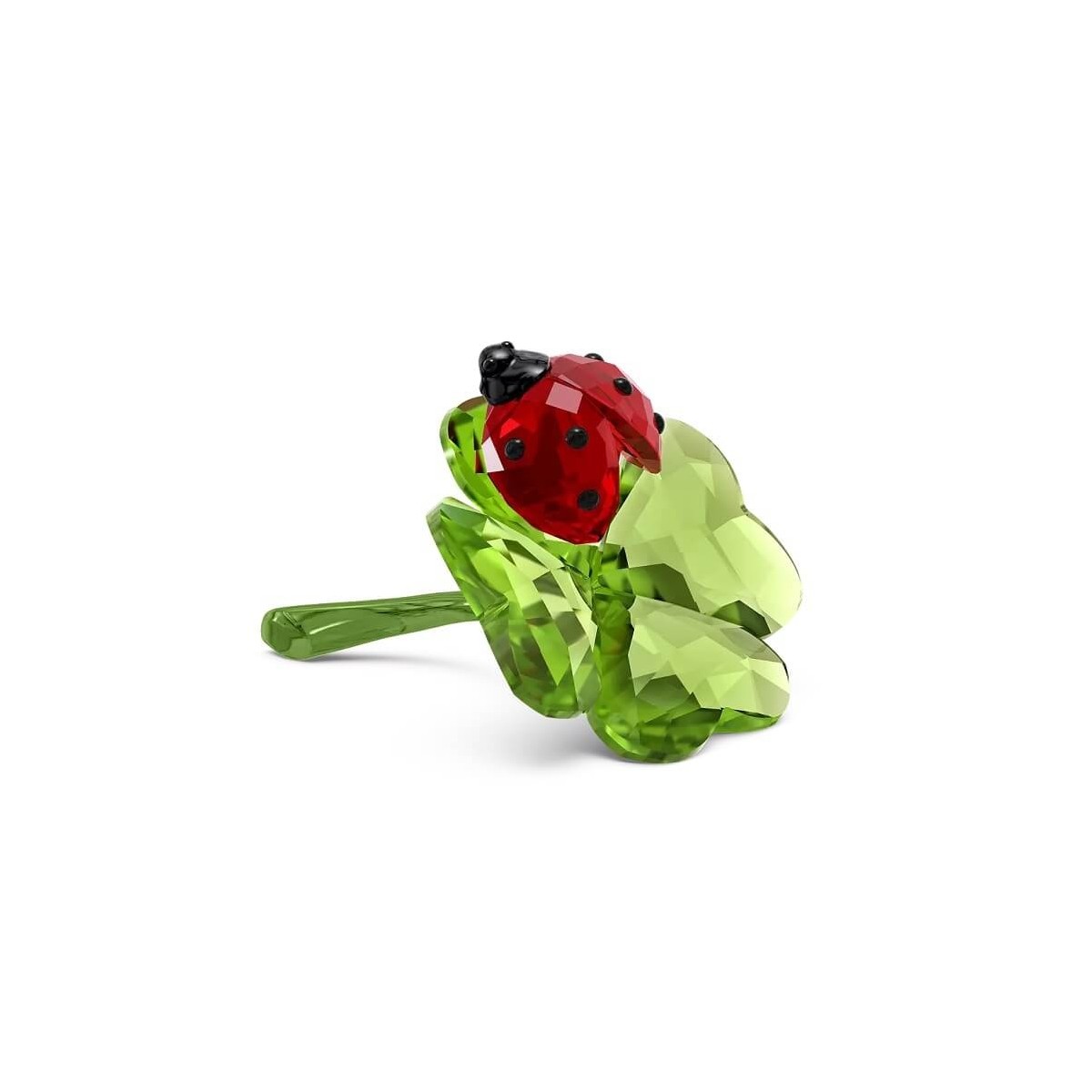 Swarovski decoration, from the Idyllia collection, represents a small ladybug sitting on a four-leaf clover. Its design is made with 315 facets of green and red crystal and a green lacquered stem, thus reflecting natural colors.