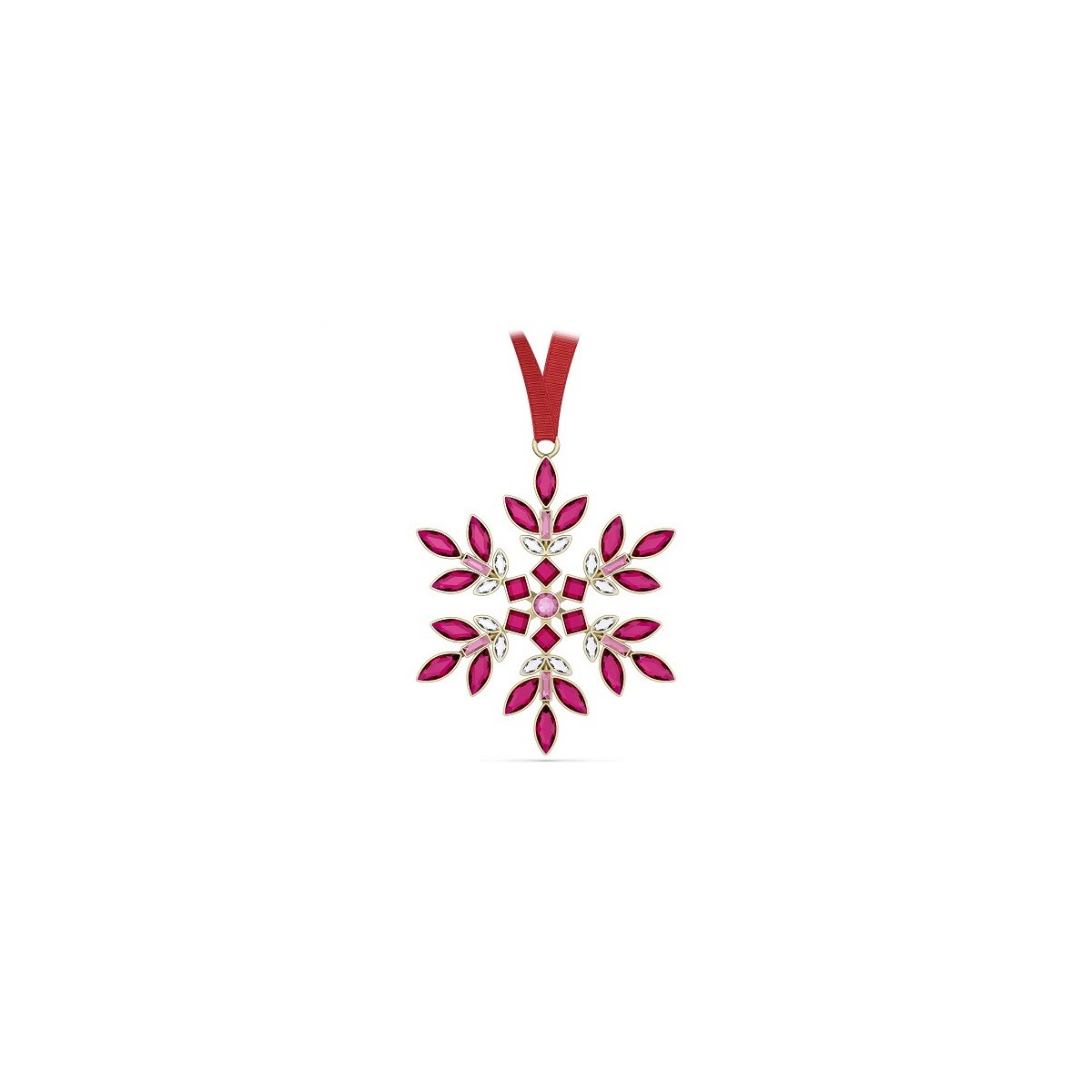 Swarovski decoration, from the Gema collection, represents the Christmas snowflake, suspended on a red grosgrain ribbon and is completed with a shiny gold-toned finish.