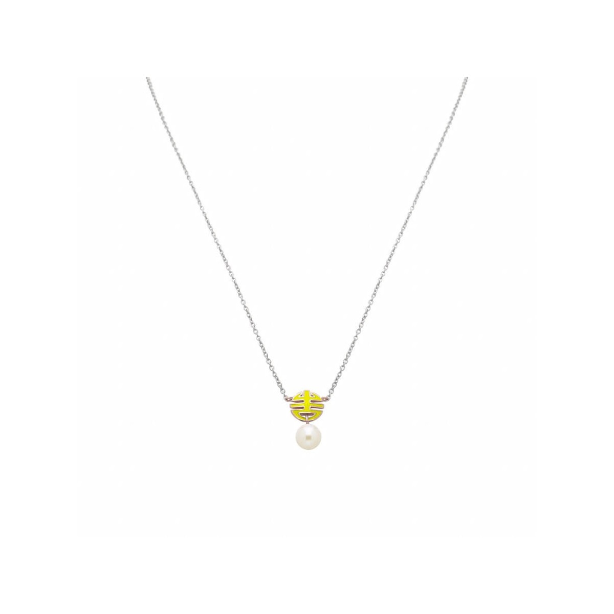 Mimì women's choker necklace, from the Ognibene collection, made in precious 925 silver with a pendant composed of the logo of the maison enamelled in a lively lime yellow color and a white Freshwater cultured pearl of 8 - 8.5 mm.