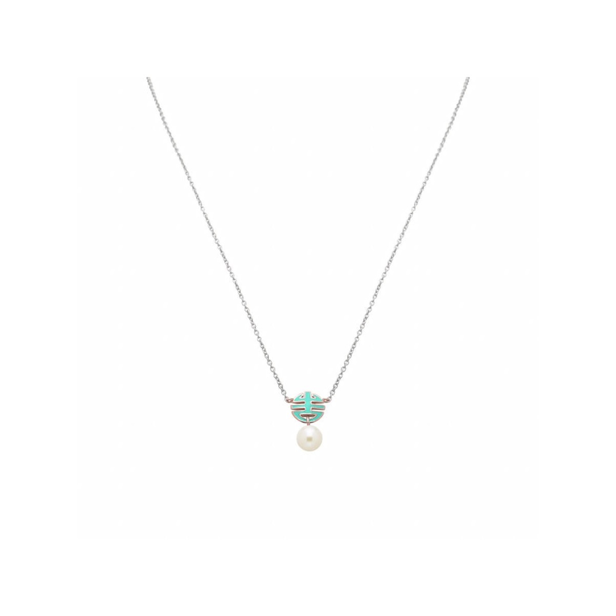 Mimì women's choker necklace, from the Ognibene collection, made in precious 925 silver with a pendant composed of the logo of the maison in 9-karat rose gold enamelled in a lively aqua green color and a white Freshwater cultured pearl of 8 - 8.5 mm.