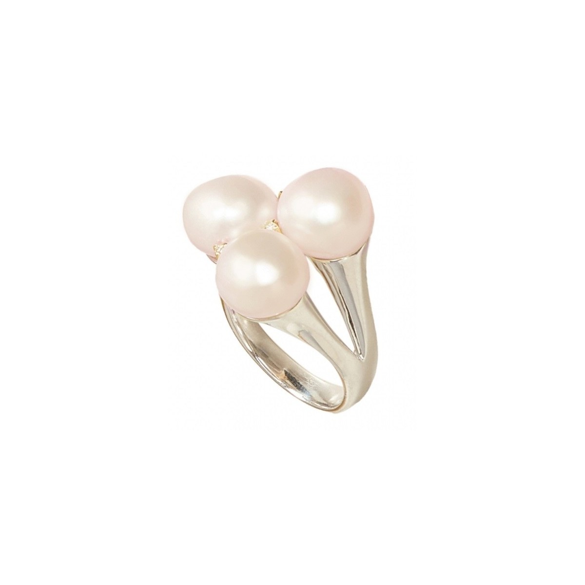 Mimì women's ring, from the Blanche collection with a bold, majestic and elegant design, made of 925 silver with three 10-11 mm FreshWater white baroque pearls and three natural diamonds set between the pearls on 18kt rose gold of 0.02 carats each (total 0.06 carats) which give shine to the ring.