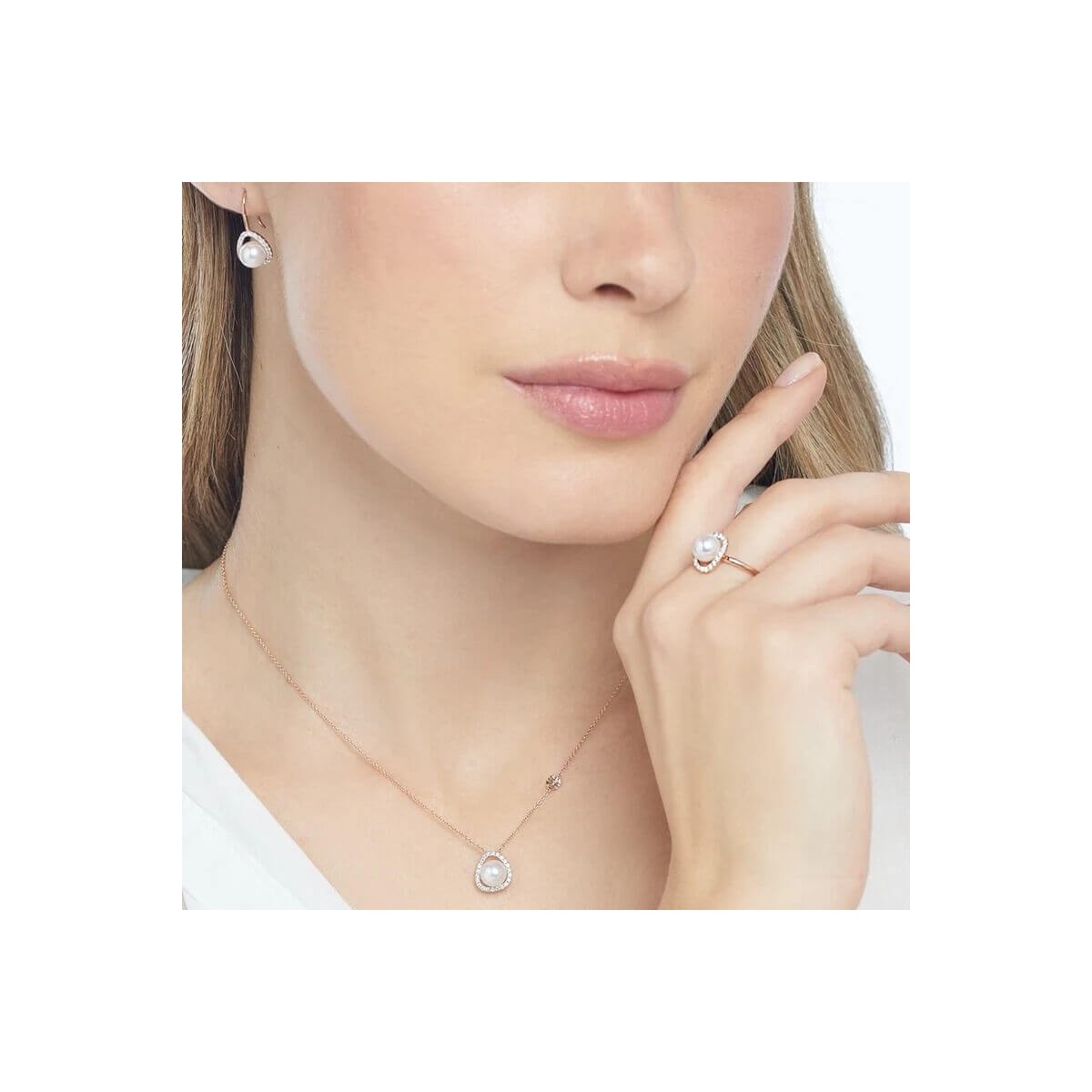 Mimì women's drop earrings from the Vivienne collection made of 18-karat rose gold and Japanese Akoya seawater cultured pearls with a diameter of 6.5/7 mm surrounded by a row of natural brilliant-cut diamonds with a total weight of 0.32 carats, with a hook closure.