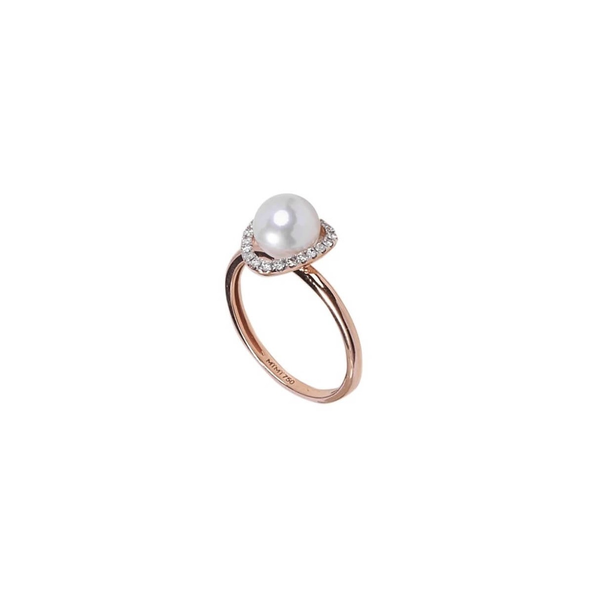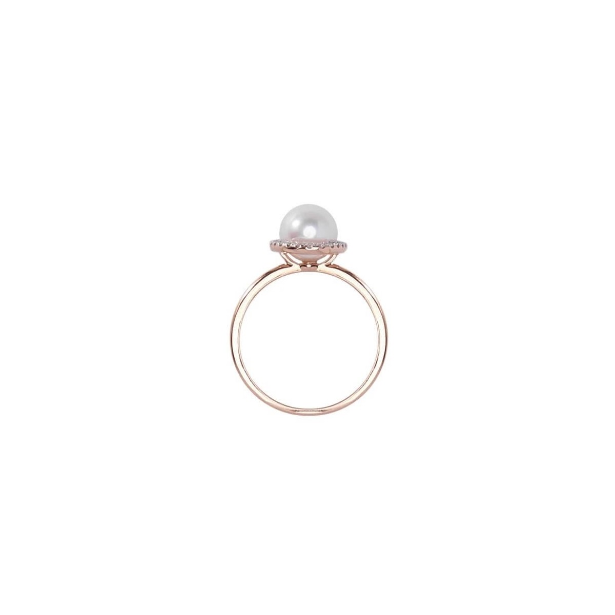 Mimì women's ring from the Vivienne collection made of 18-karat rose gold and a 6.5/7 mm diameter Japanese Akoya seawater cultured pearl surrounded by a row of natural brilliant-cut diamonds with a total weight of 0.16 carats, lobster clasp closure.