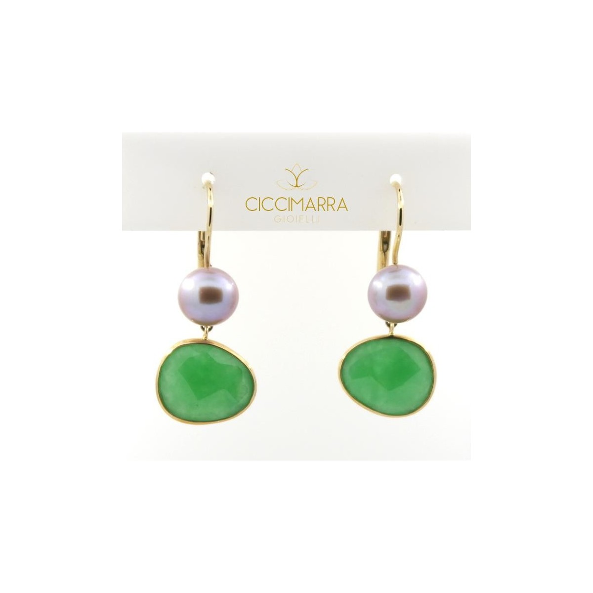 Earrings in 18kt gold with green jade and natural purple pearl, line Talita