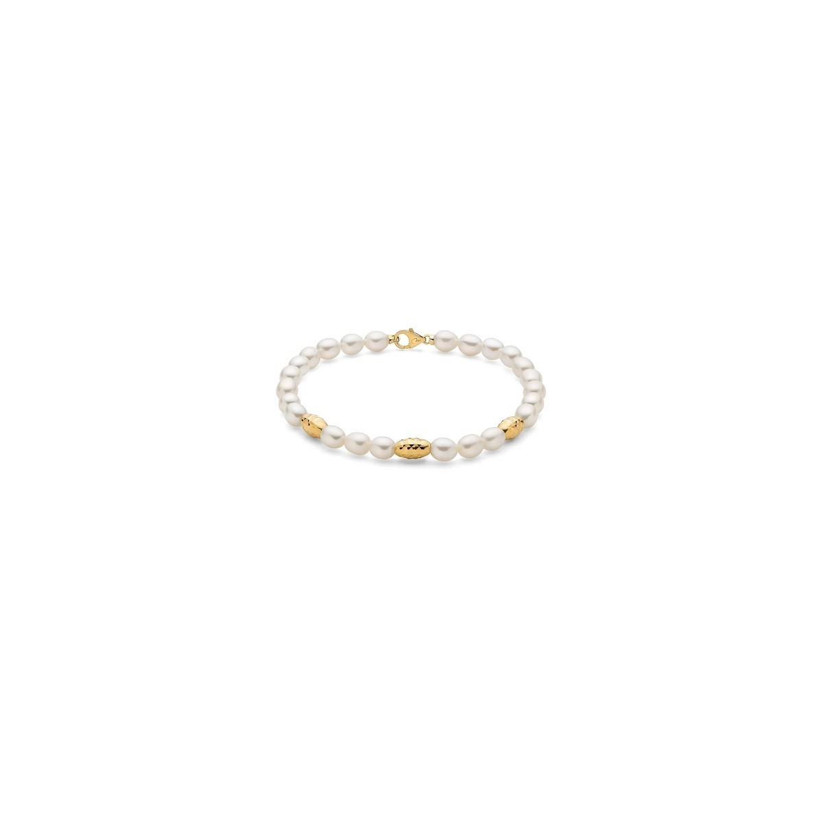 Bracelet with white cultured rice-shaped pearls and hammered and yellow-plated silver nuggets, gold-plated lobster clasp.