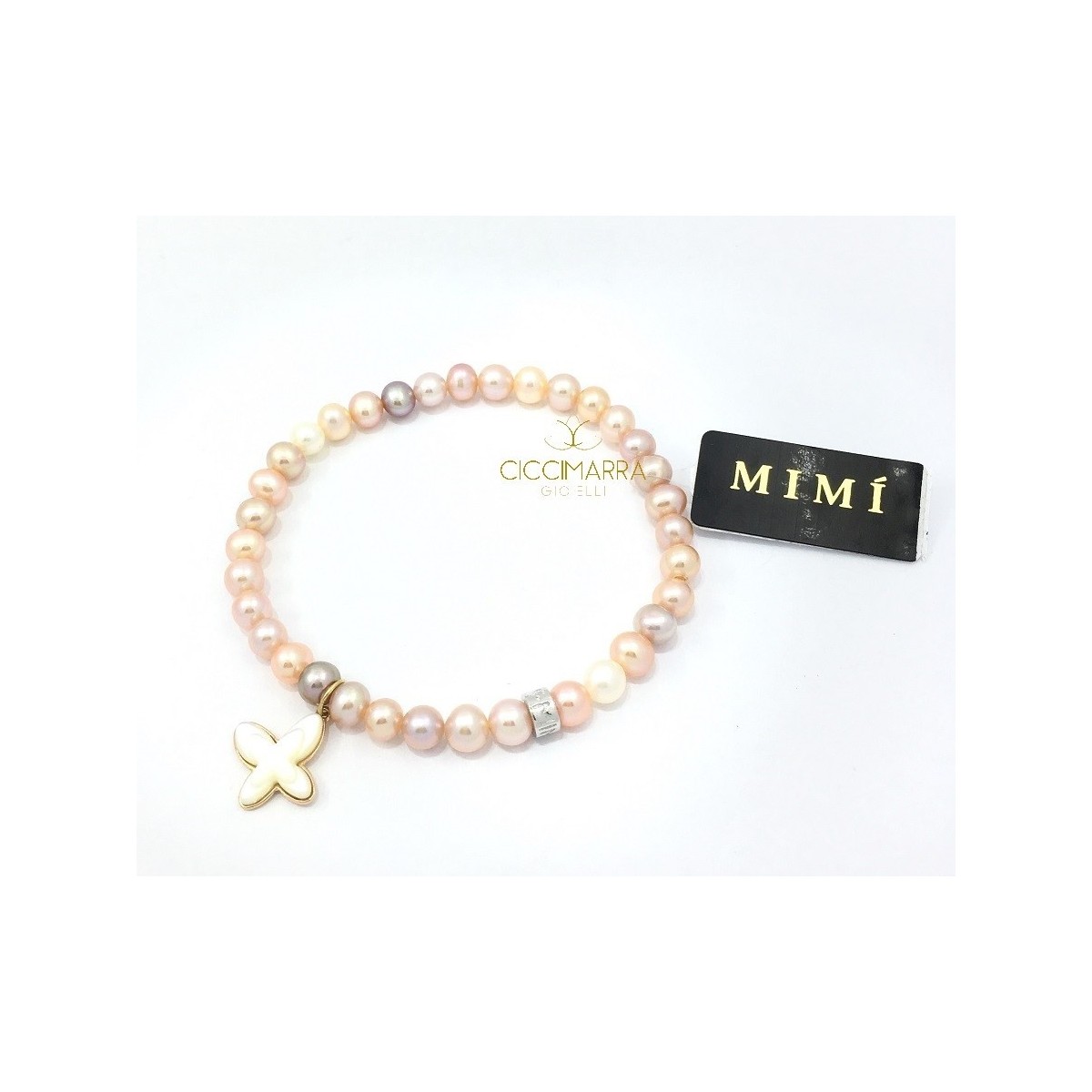 FreeVola elastic bracelet in pearls of different colors, butterfly-shaped pendant in mother-of-pearl with rose gold structure and Mimi logo in silver B0M023E4M