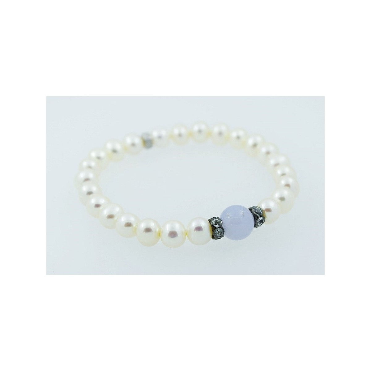 Elastic bracelet with white pearls, silver, chalcedony stone color blue and white sapphires