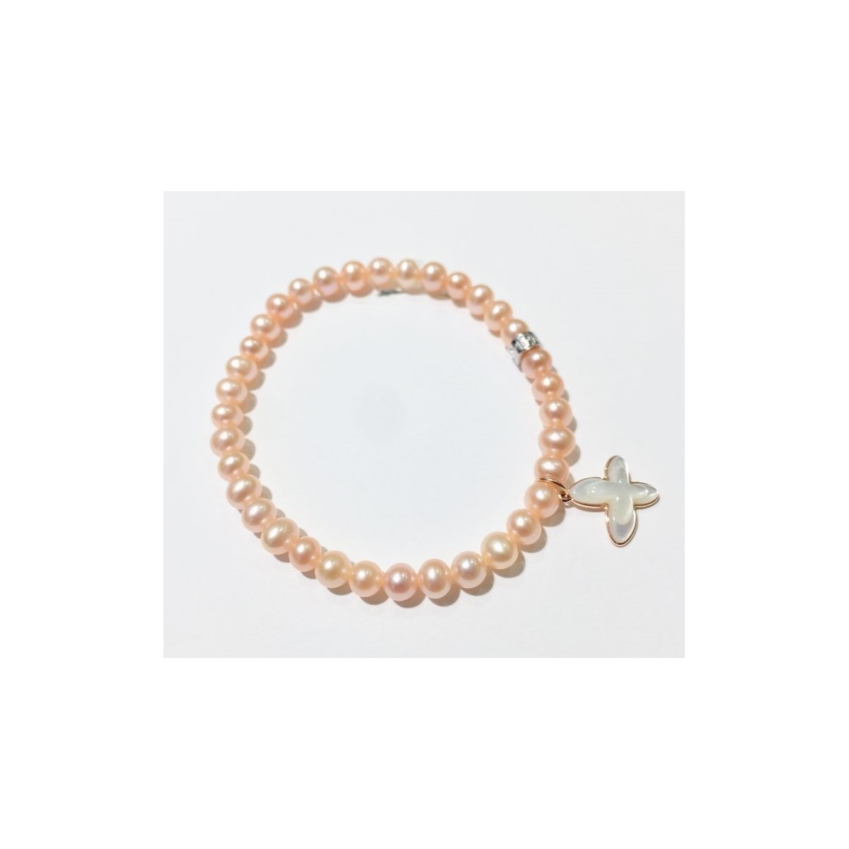 FreeVola elastic bracelet in cream pearls, mother-of-pearl butterfly pendant with rose gold structure and Mimi silver logo B0M023E2M