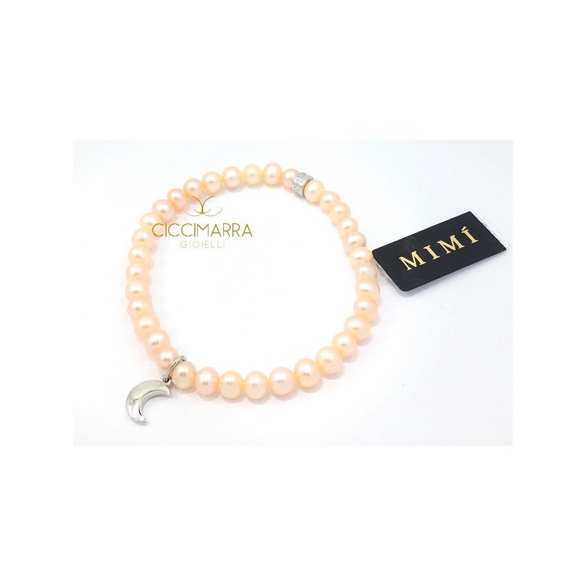 Elastic bracelet in cream pearls with moon-shaped pendant and Mimi logo in 925 silver - B0M026A2