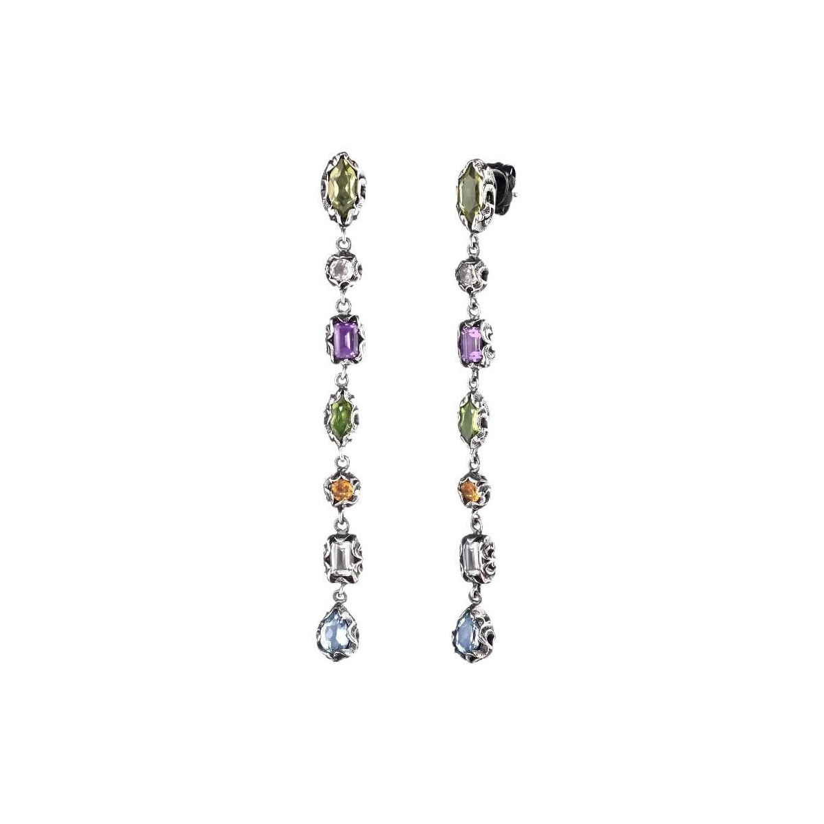 Burnished silver pendant earrings hand-engraved with the ancient burin technique by selected Italian goldsmiths. The natural gems with faceted cuts of various colors illuminate and embellish this singular earring.