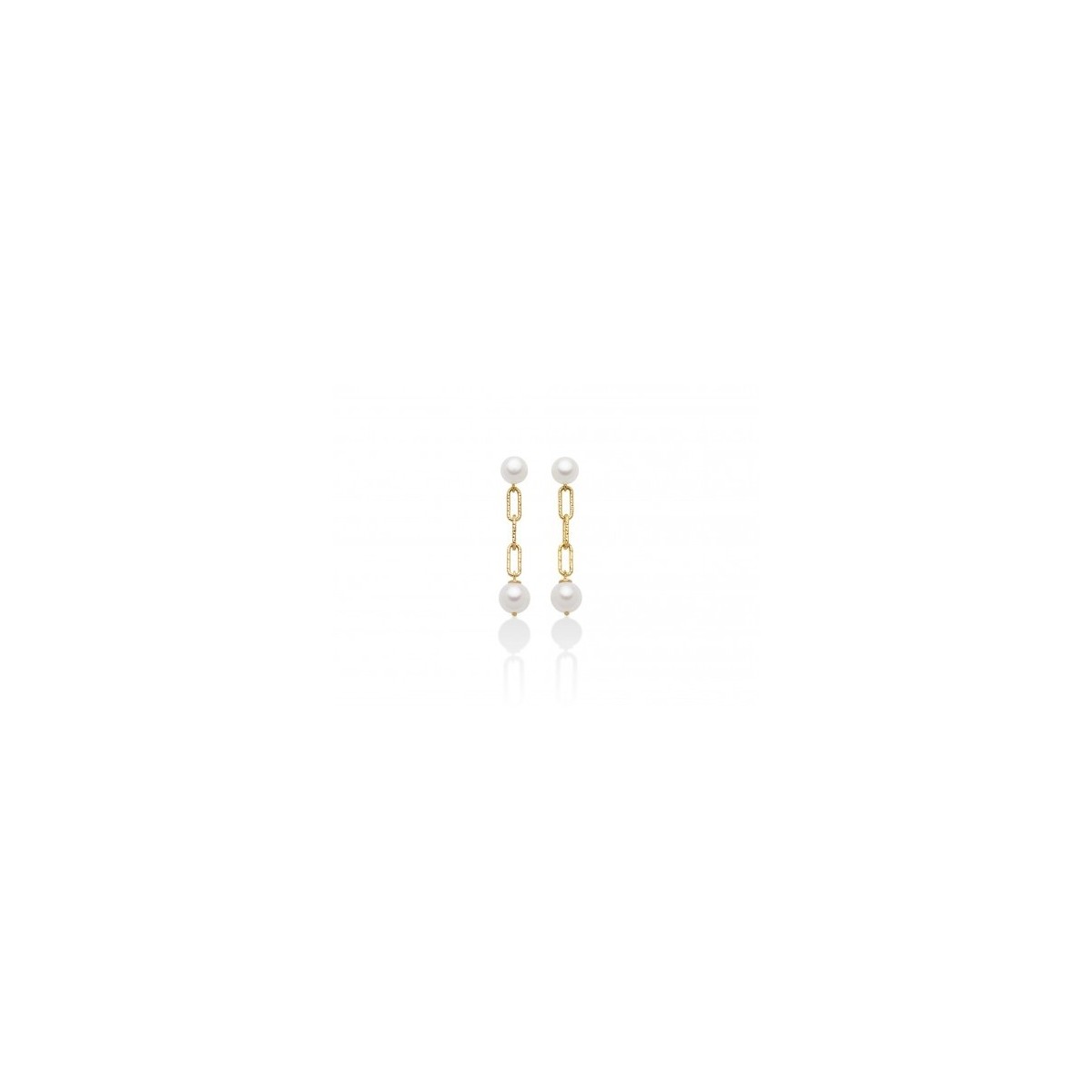 Earrings from the Miss Italia collection in yellow gold plated silver with chain and 2 Fresh Water pearls with a diameter of 6.5 - 7 and 7.5 - 8 mm. Pin closure