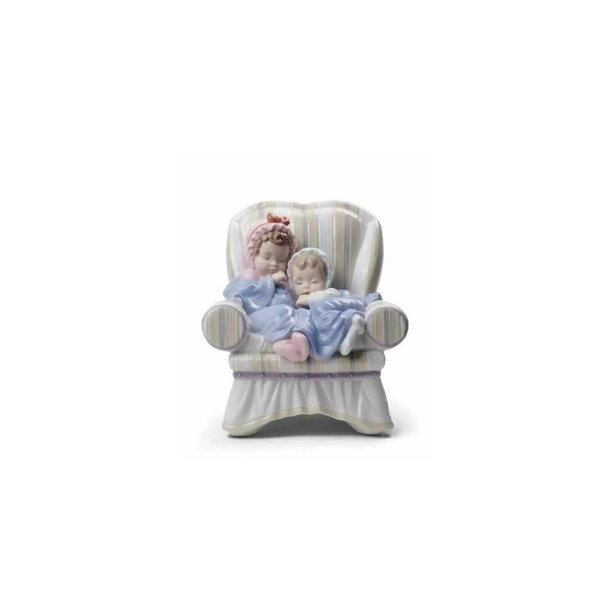 Lladrò statue in bright porcelain, handcrafted by the sculptor José Santaeulalia, depicting two children asleep sitting on a striped sofa with funny hats covered with a blue blanket. A tender scene full of nostalgia and sweetness. The dresses of the two adorable little girls who interpret it and the style of the armchair speak of a romantic and sentimental period that brings out our dearest memories. A piece in glossy porcelain, decorated in pastel colors, ideal as a gift, collectible or decoration.