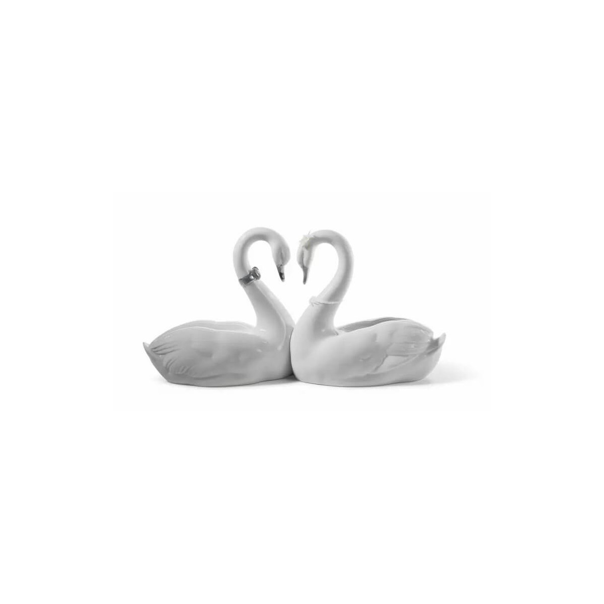 Lladrò statue in glossy white porcelain, handmade by the sculptor José Puche, representing a pair of swans whose heads form a heart, with floral details and silver luster. This romantic pair of swans acquires a contemporary style thanks to the contrast between the matt white porcelain finish and the silver sheen that enhances some details of the piece.