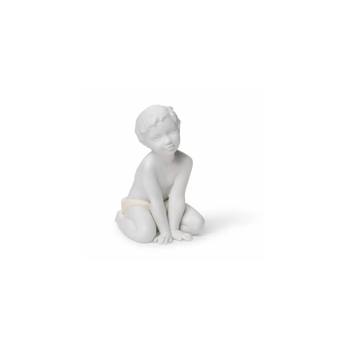 Lladrò statue in opaque white porcelain, handmade by the sculptor José Javier Malavia, representing a seated child wearing pastel-colored clothing. Collection that represents the different members of a family with a natural and contemporary treatment. The pieces have a sculptural treatment that makes us see the perfection of the modeling with which they are performed. A song to love, from family life, from really important things.
