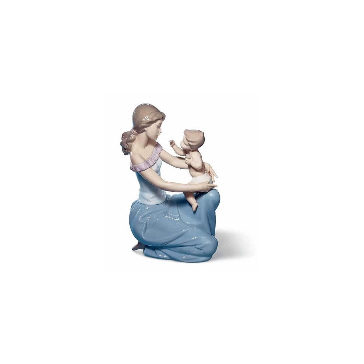 Lladrò statue, handmade by the sculptor Juan Ignacio Aliena, in glossy porcelain decorated with soft pastel colors, representing a woman playing with her son on her legs. There is no stronger and greater bond than that between mother and child, a scene of tenderness, love and fun.