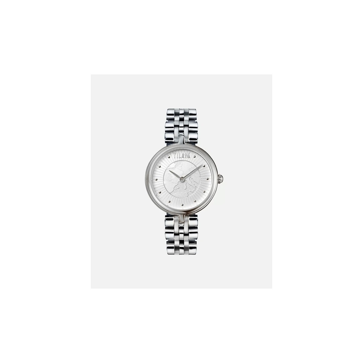 Alviero Martini 1a Classe women's watch, from the Zanzibar collection, made of stainless steel, white dial enriched by the engraving with the iconic map and double 1C and 1a Classe logo that create an elegant play of contrasts.