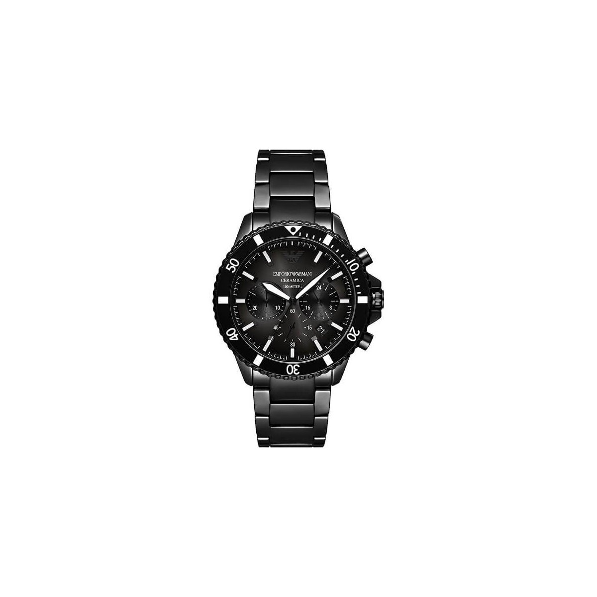 Armani men's watch with quartz chronograph function. The watch features a black ceramic bracelet. Made of ceramic with a round-shaped case with a glossy black finish. Gray dial. Deployant clasp.