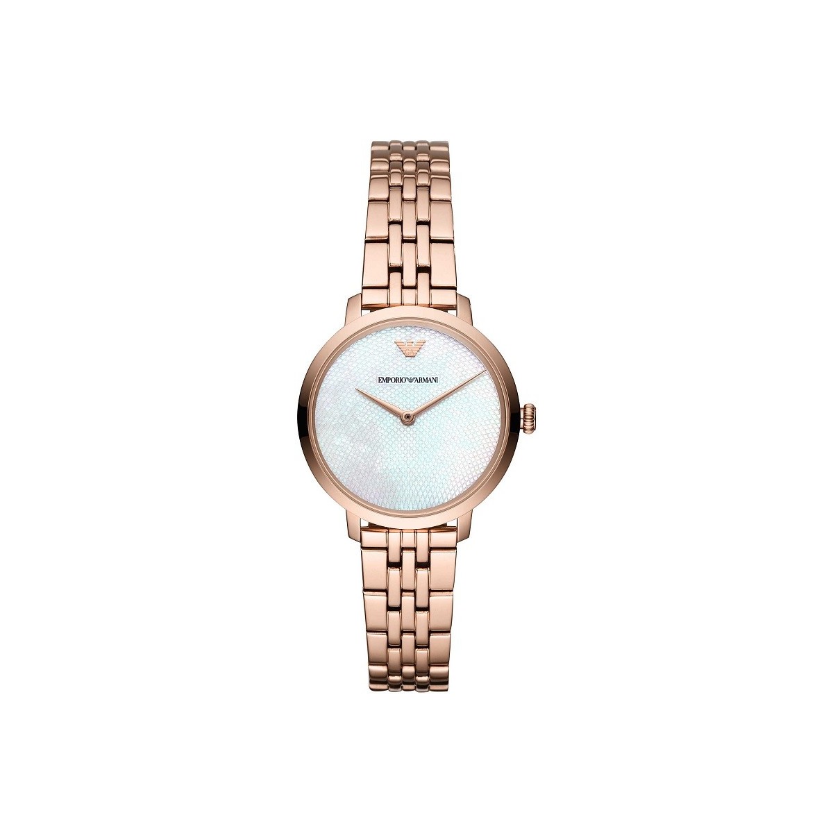 Time-only woman watch with rose gold stainless steel bracelet, stainless steel case and knurled mother-of-pearl dial with applied logo and engraving; folding clasp