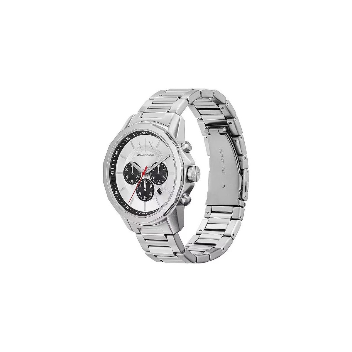 Armani Exchange men's watch, with chronograph quartz movement, made of stainless steel with round-shaped case with a mixed finish in silver color, silver color dial, bracelet in stainless steel with mixed finish. Deployant clasp.