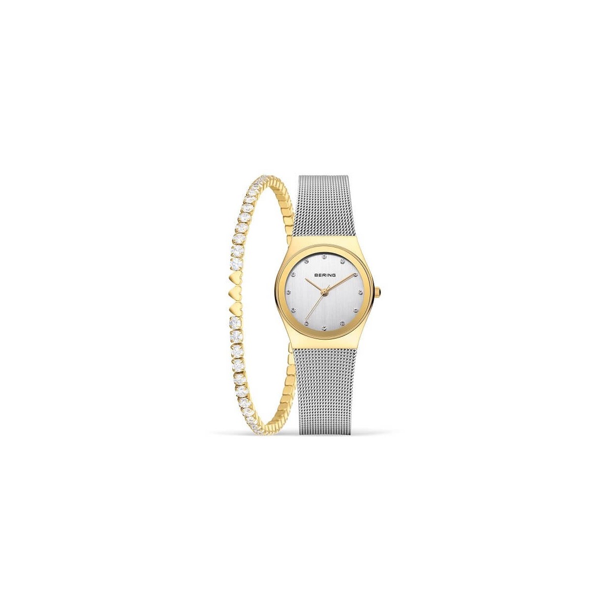 Bering watch and bracelet belonging to the Classic collection. Made of polished steel and yellow gold. Gray Milanese mesh strap, flat case with white scratch-resistant sapphire crystal.